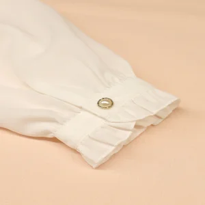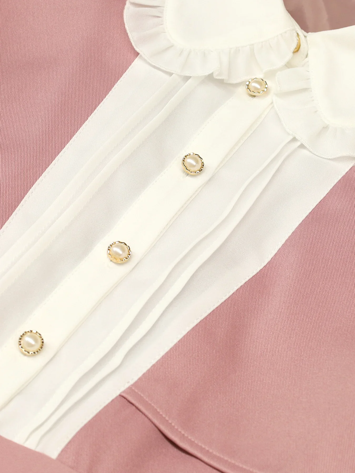 袖は半袖部分で取り外しができる2way袖になっています。半袖にすると袖部分がケープで隠れる仕様になっているので、長袖と半袖で雰囲気が変わるのもポイントです。衿、ヨーク、袖、裾フリルがジョーゼット生地の配色になっています。