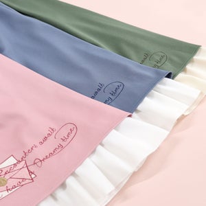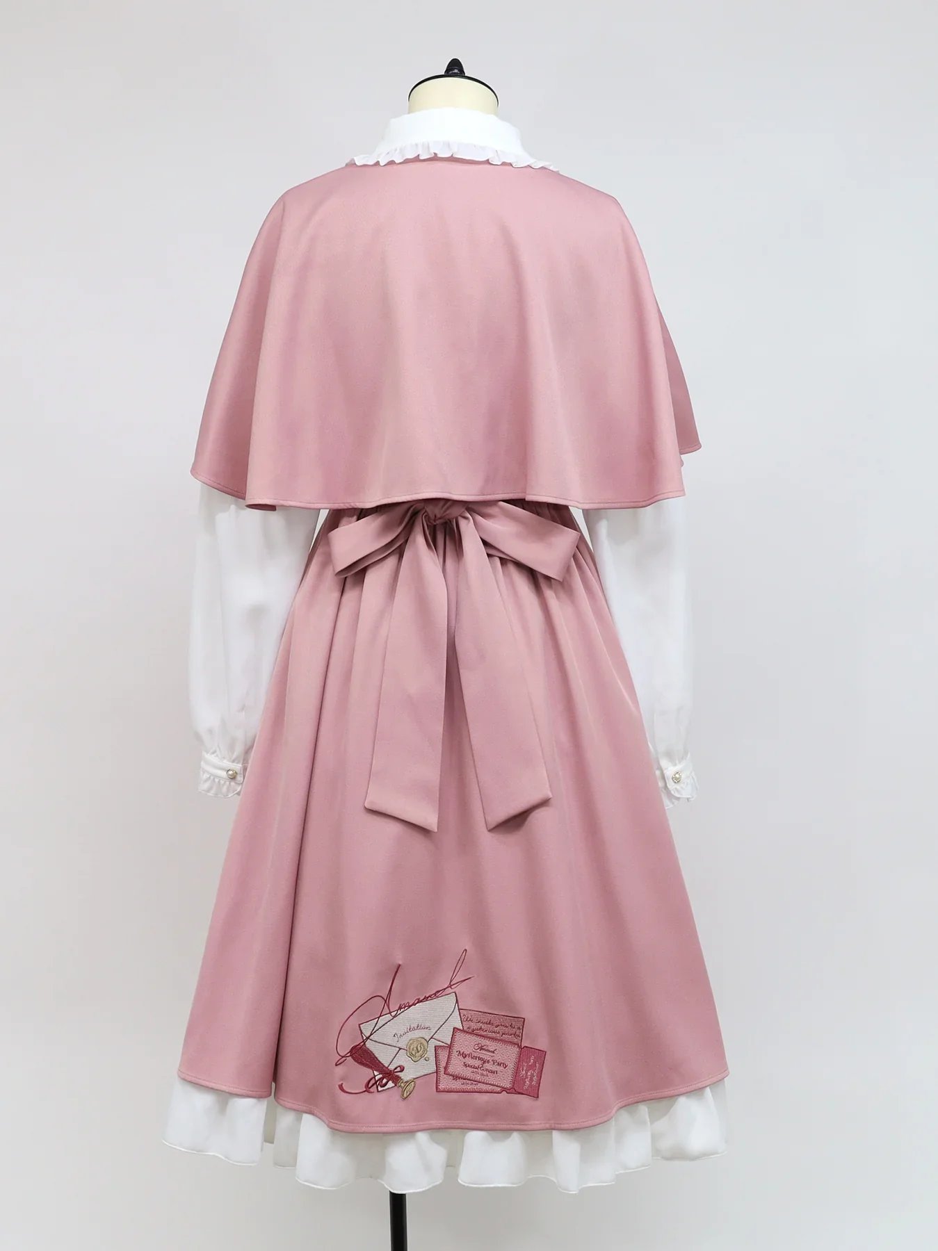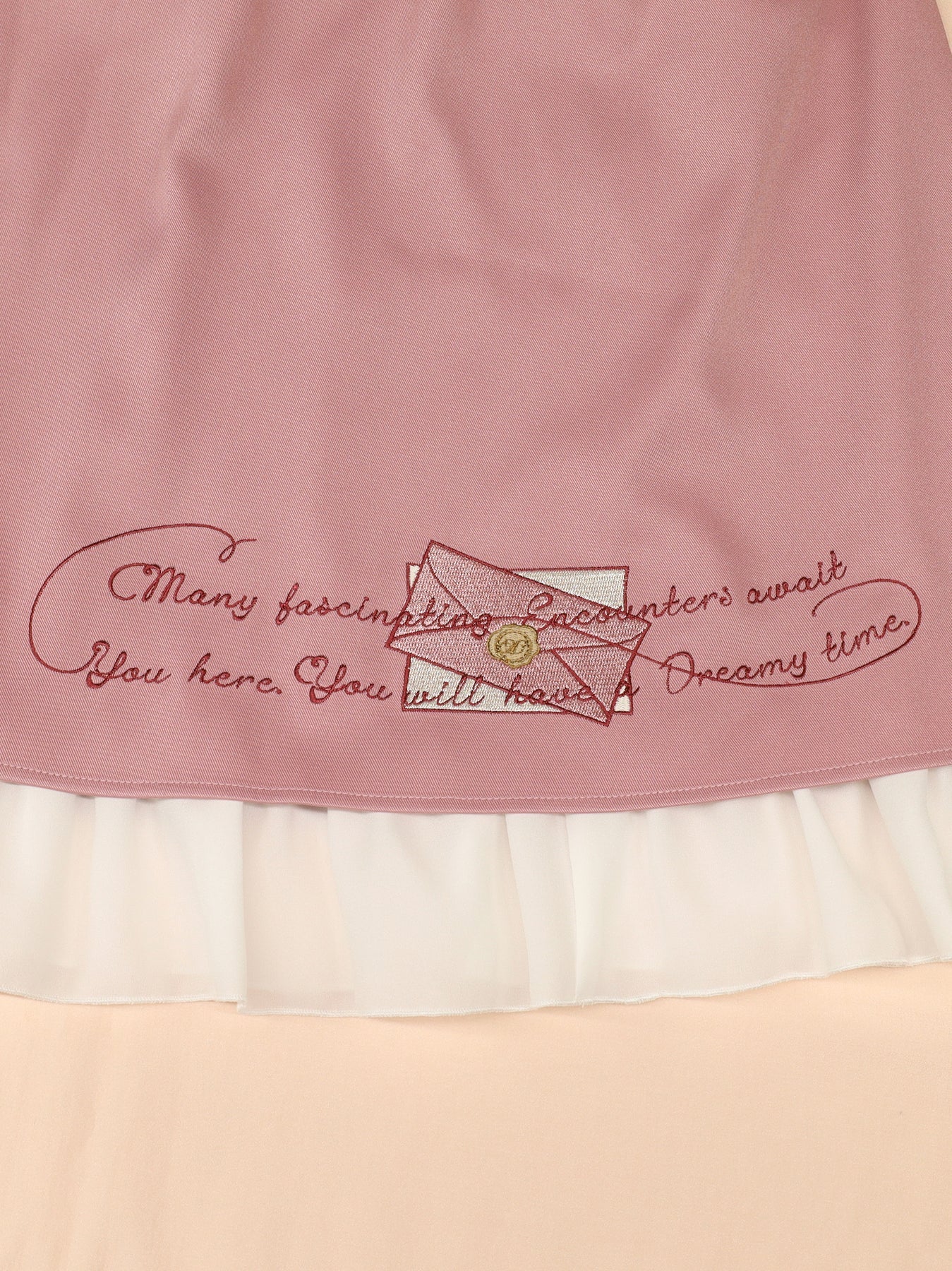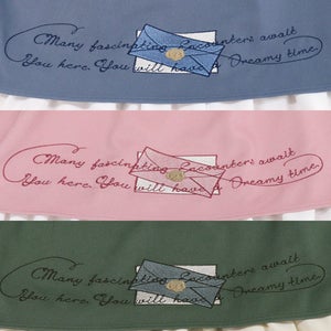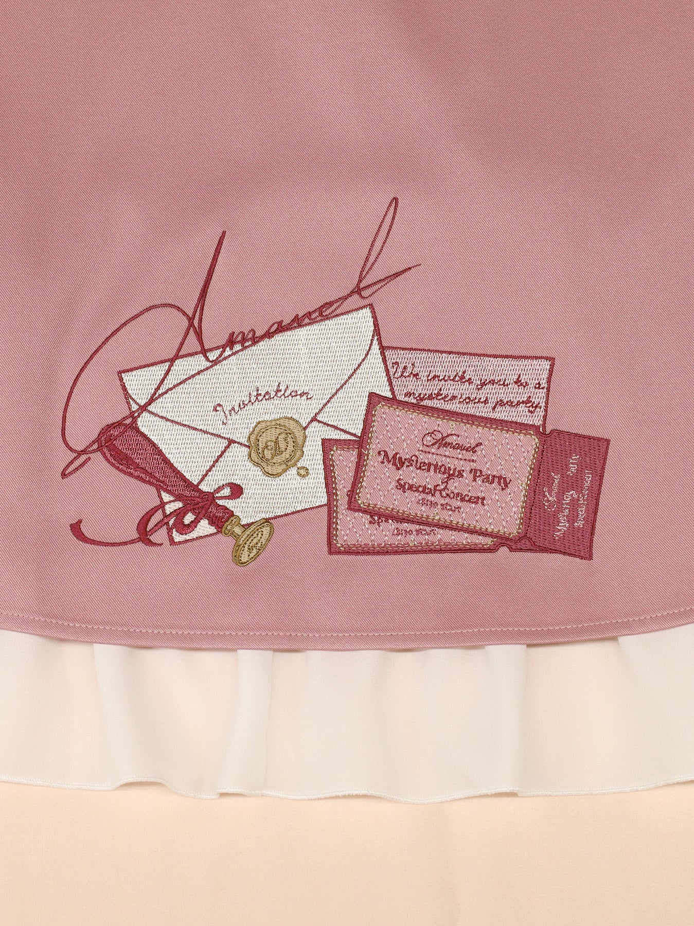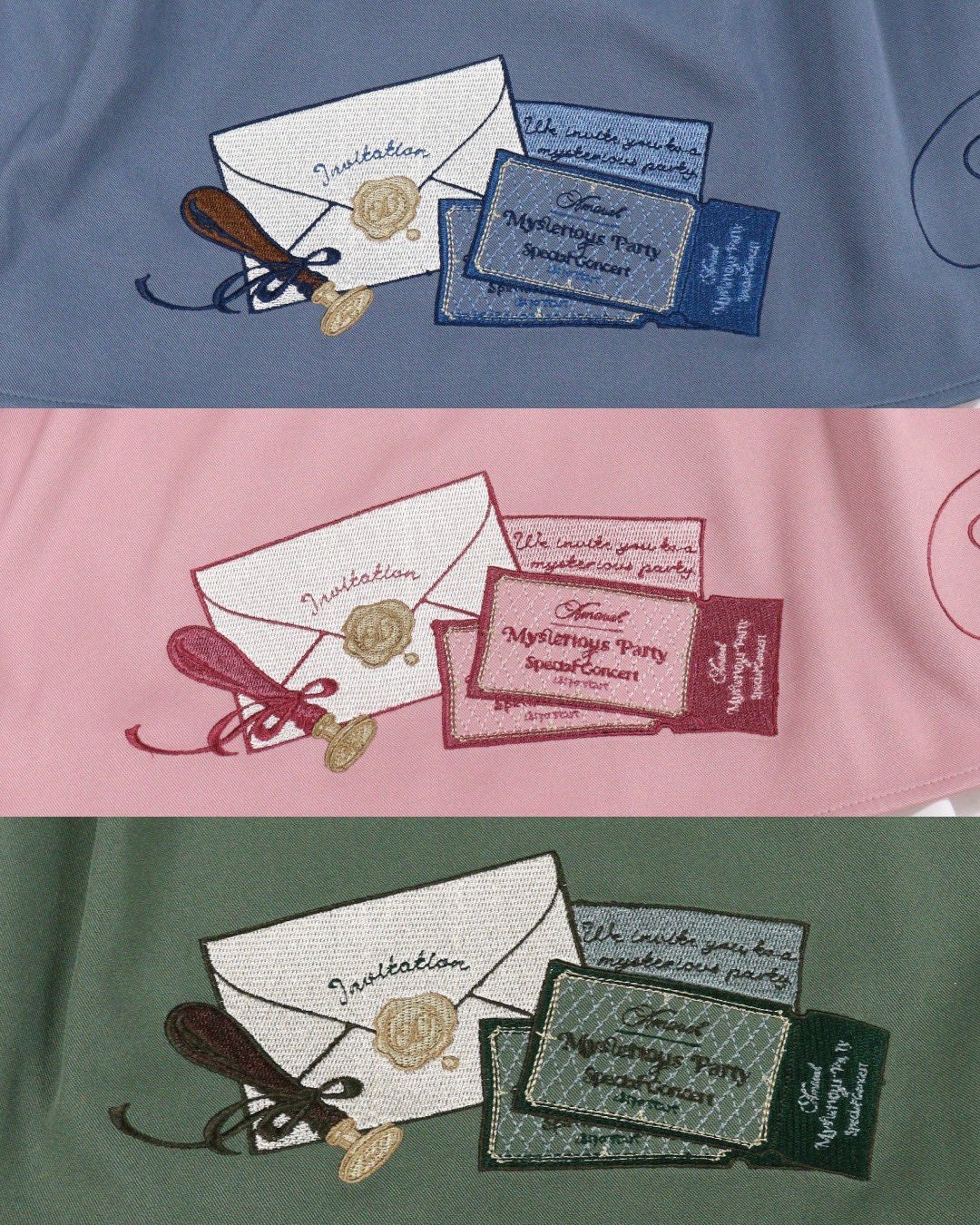The hem is embroidered with an invitation, envelope, sealing stamp, and more.