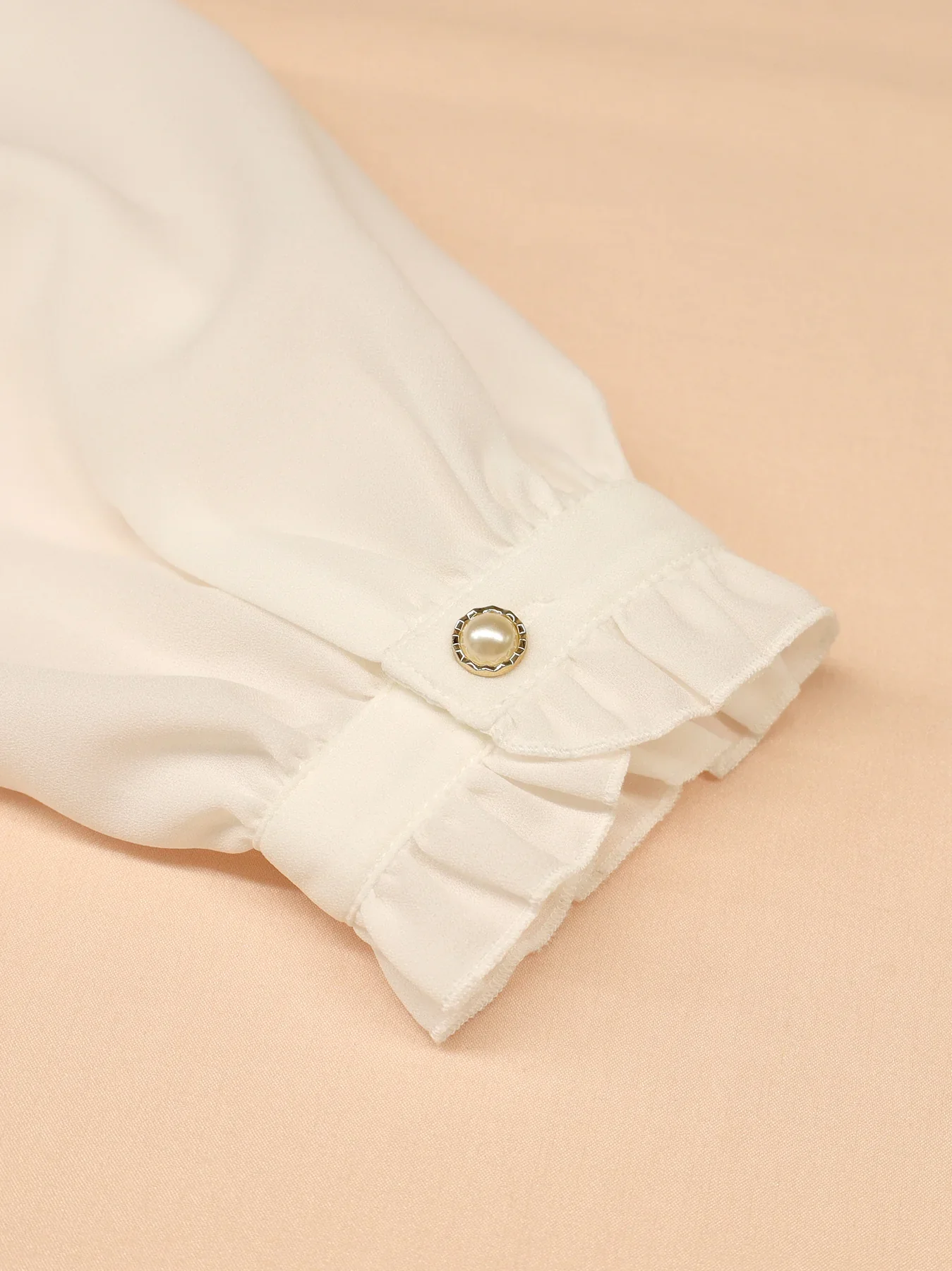 The collar, yoke, sleeves, and hem ruffles are made of georgette fabric in a matching color.