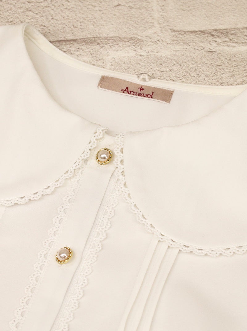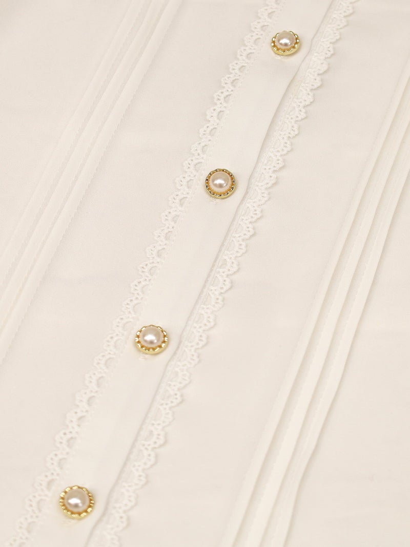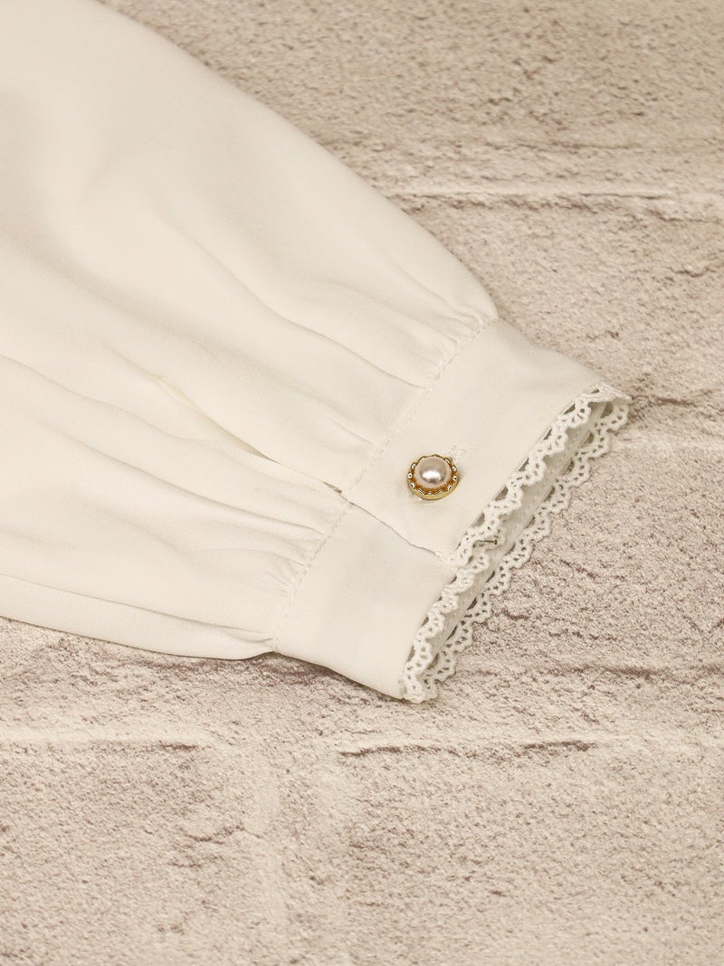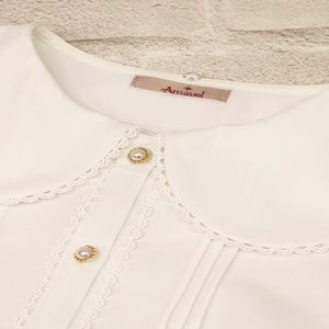Delicate picot lace is subtly inserted along the collar edge, sleeve cuffs, and front placket, adding a touch of sweetness.