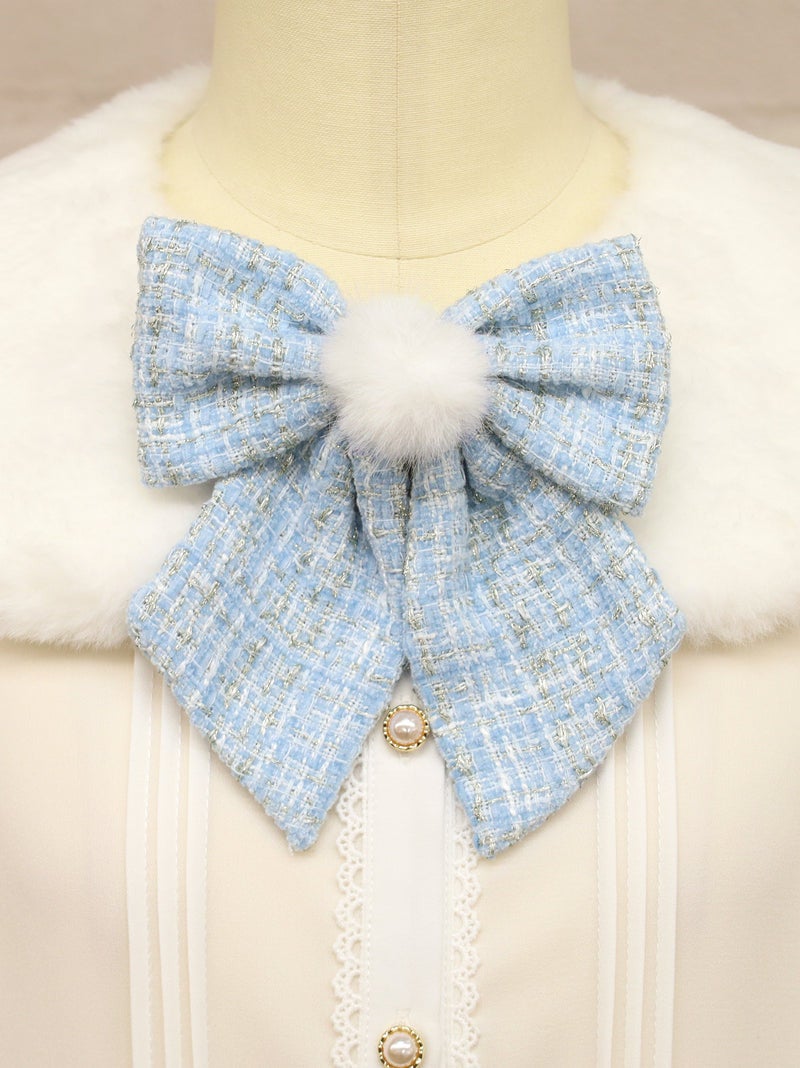 The ribbon brooch at the chest is made from the same fabric as the tweed skirt released on the same day.