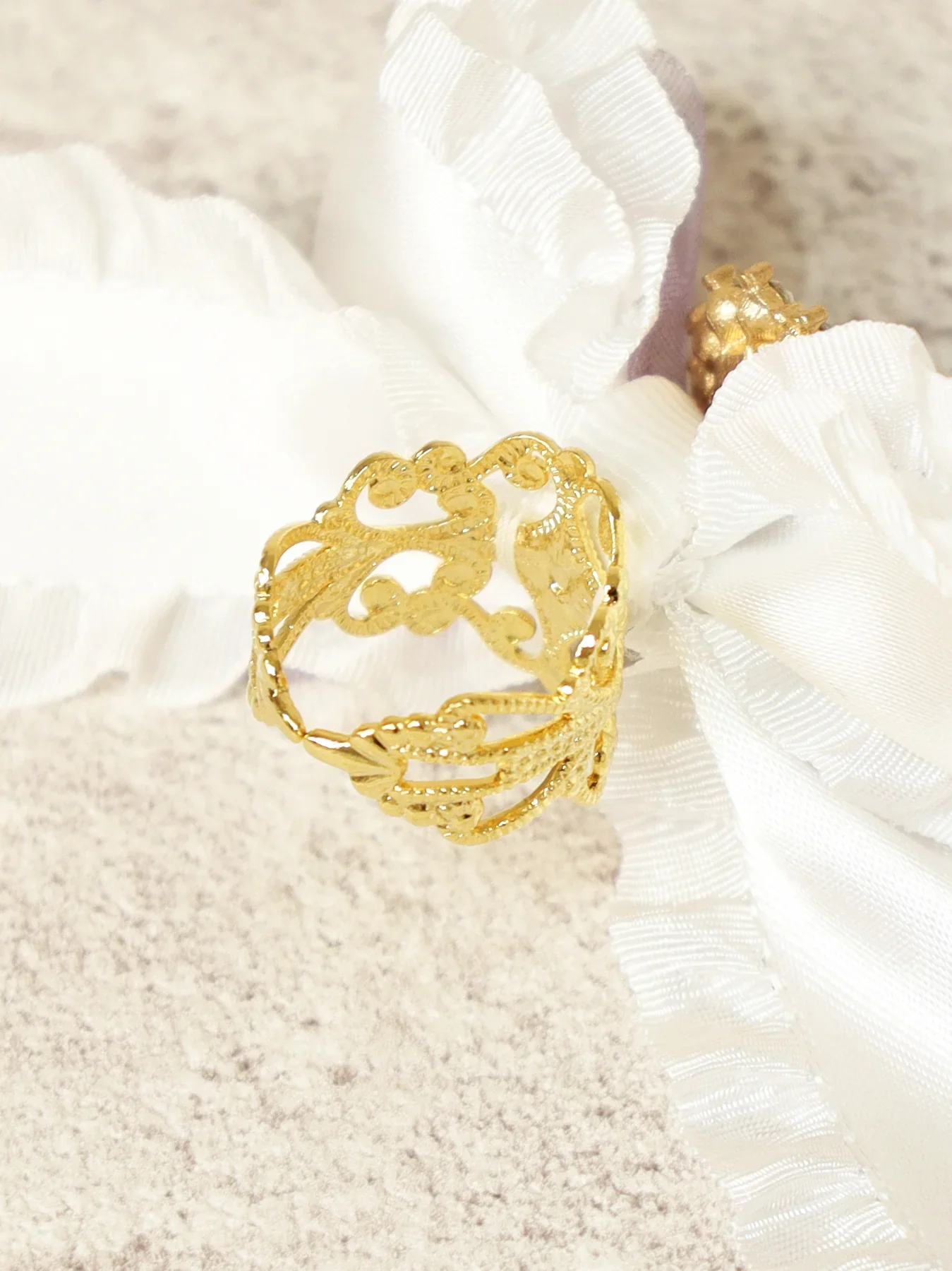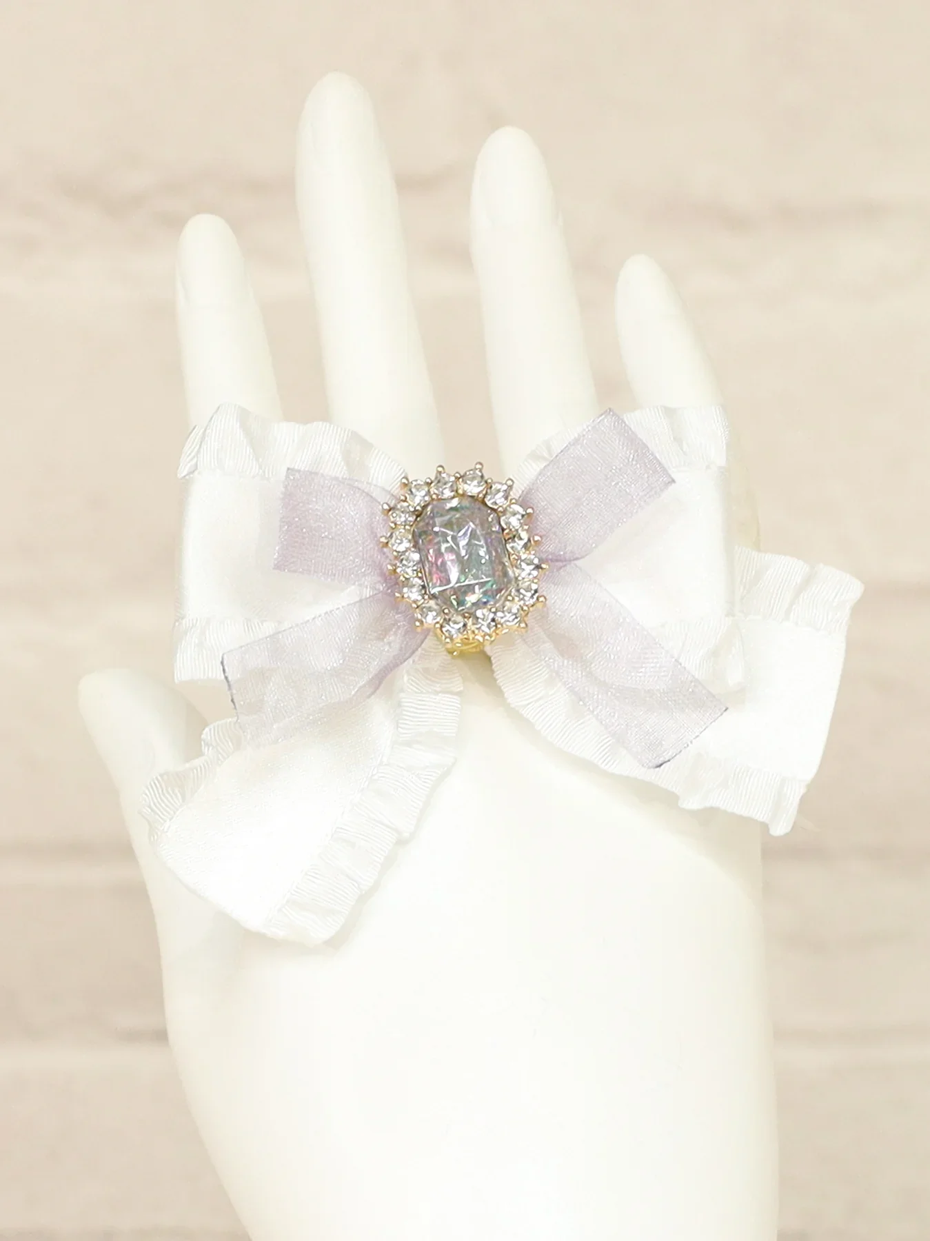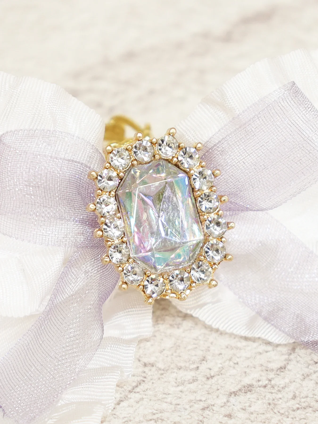 The ring features the same overlapping design as the ribbon clip, with ruffled ribbon and organza ribbon overlapping, and a square jewel in the center.