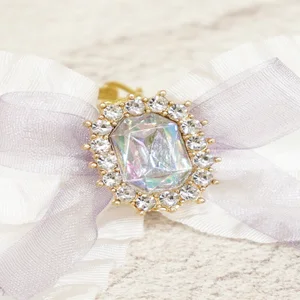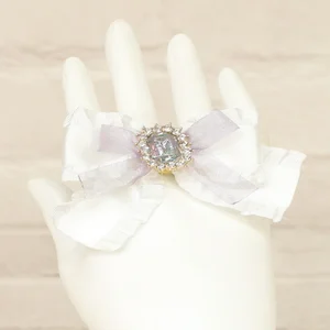 リング部分はリボンクリップと同じくフリルリボンとオーガンジーリボンが重なった重なったデザインで、中央にはスクエアのビジューが付いています。