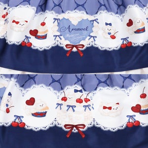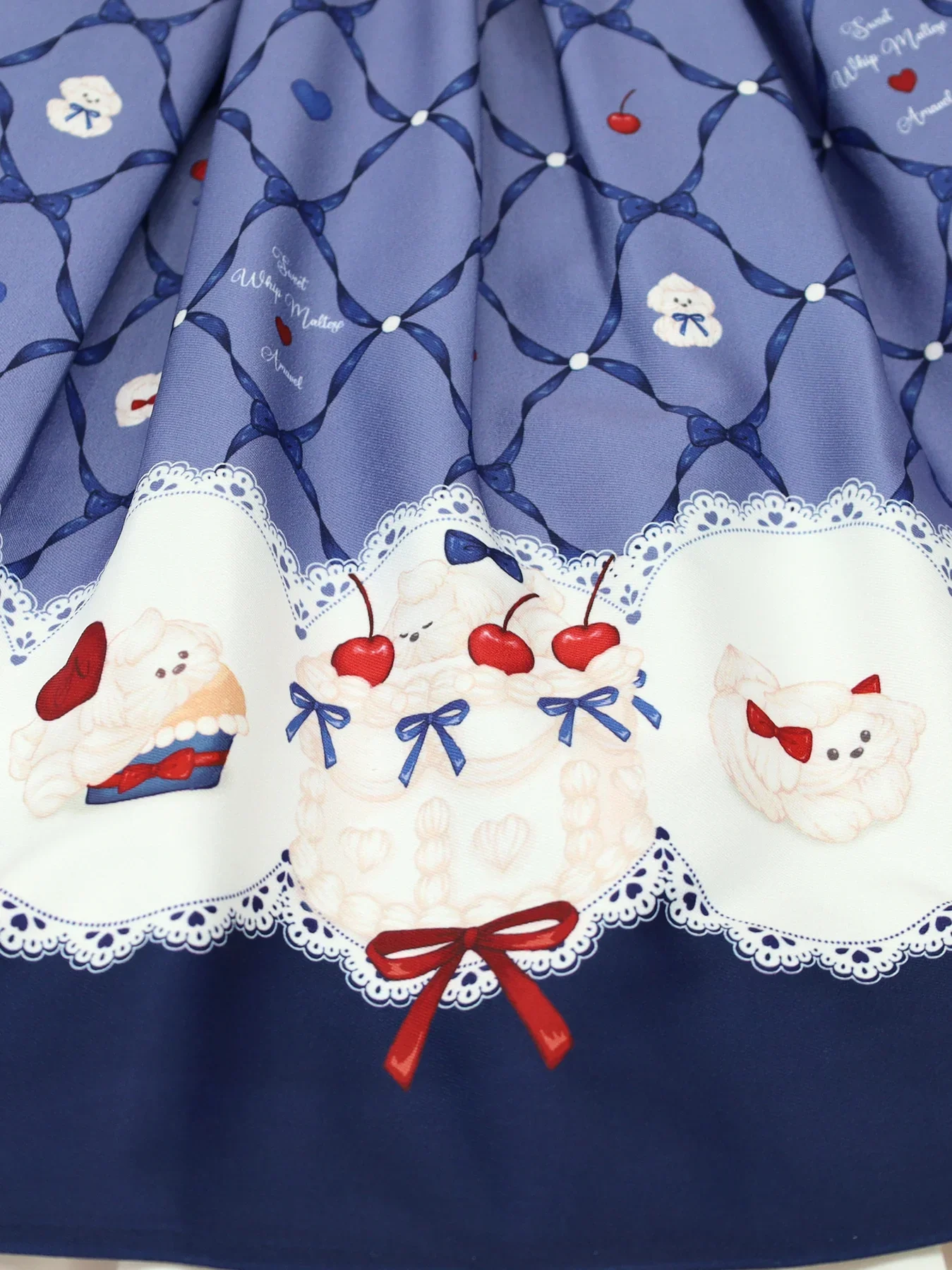 プリントの裾にはホイップで出来たワンちゃん、さくらんぼとリボンのデコレーションケーキ、カップケーキ、アイシングクッキー、AWのテーマがプリントされています。