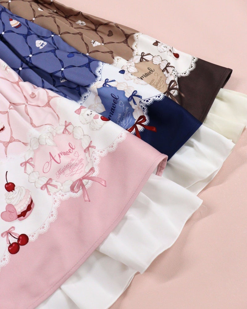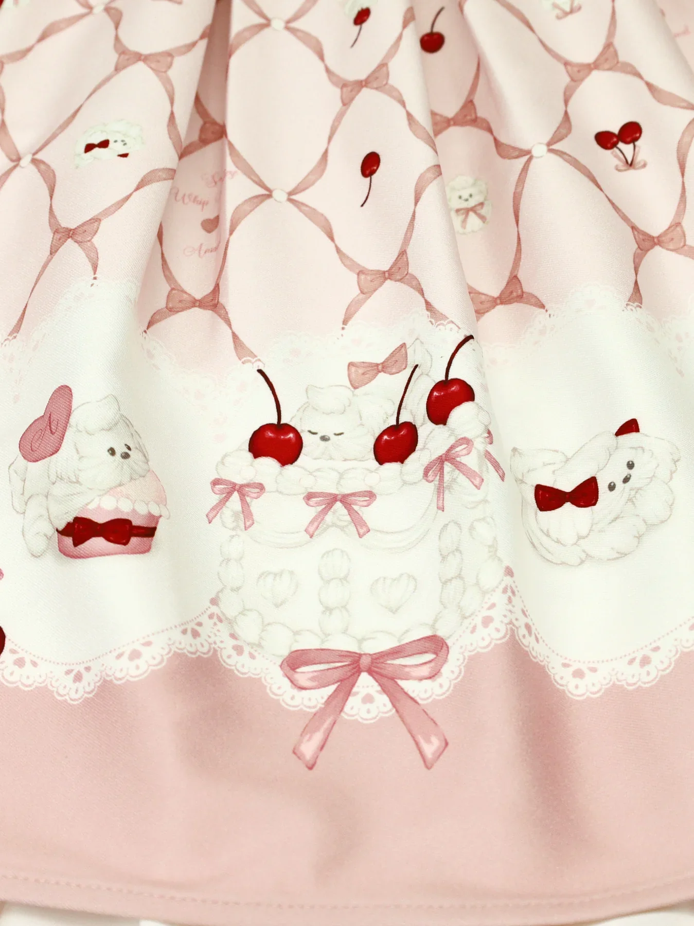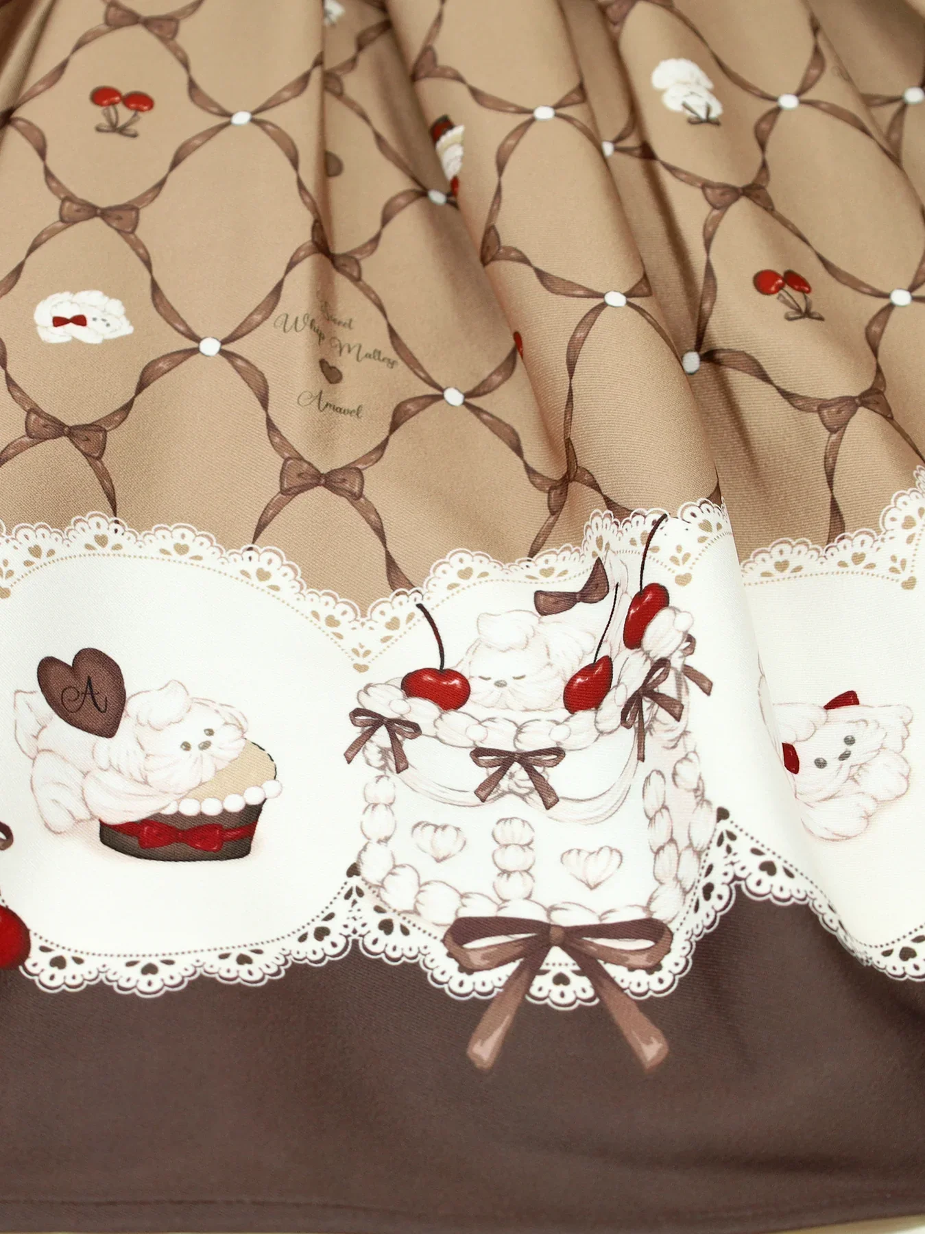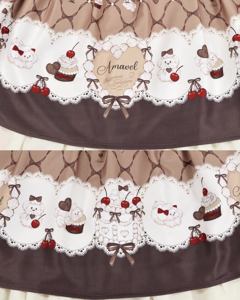 The hem of the print features whipped cream dogs, cakes decorated with cherries and ribbons, cupcakes, icing cookies, and the Autumn/Winter theme.