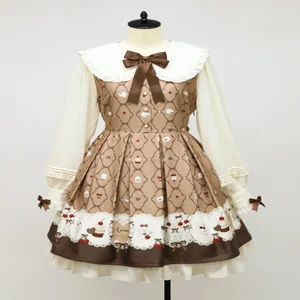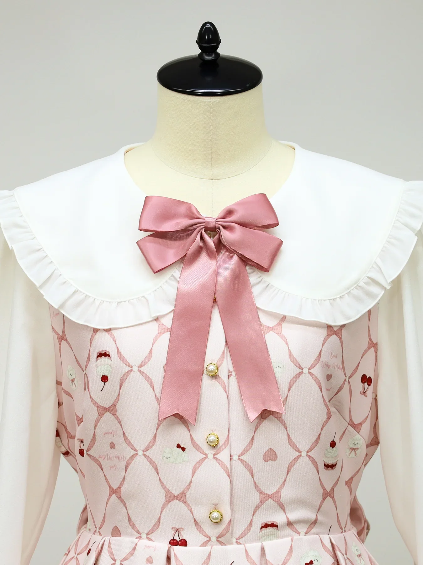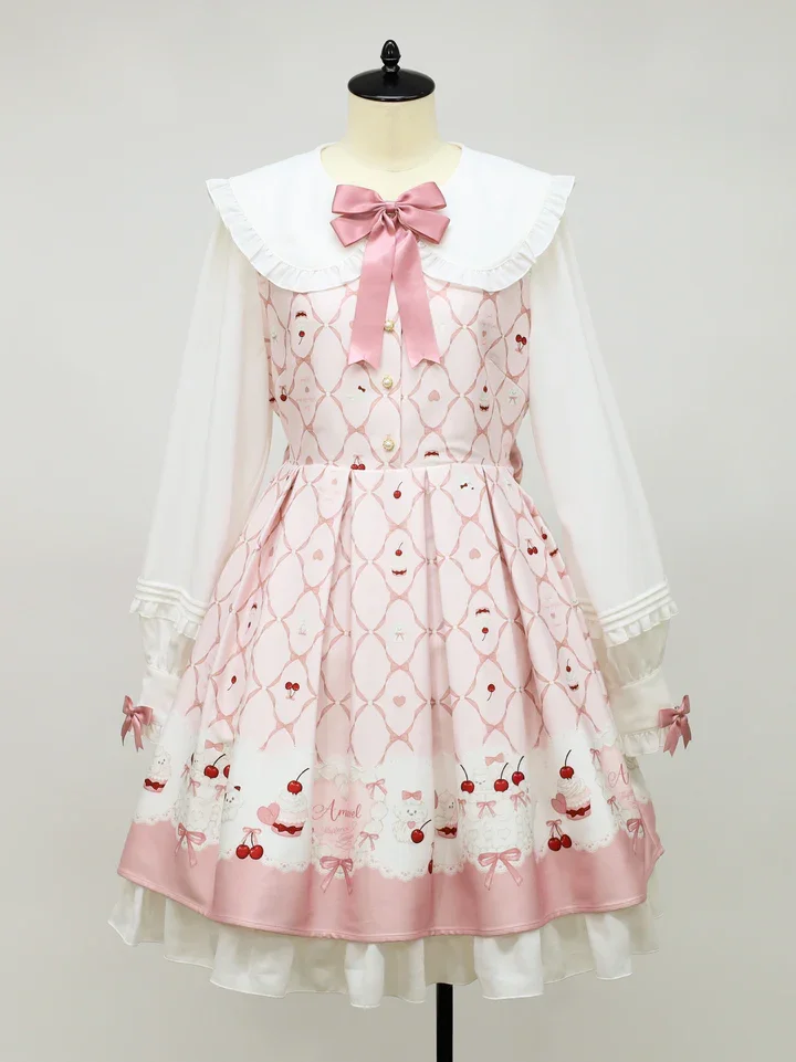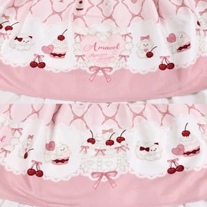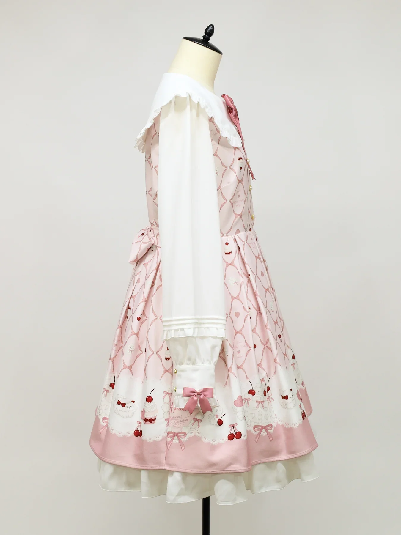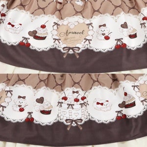 The hem of the print features whipped cream dogs, cakes decorated with cherries and ribbons, cupcakes, icing cookies, and the Autumn/Winter theme.