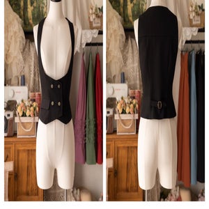 This vest has 2 rows of button decorations, 2 pocket embellishments, and back cross-over tie detail.