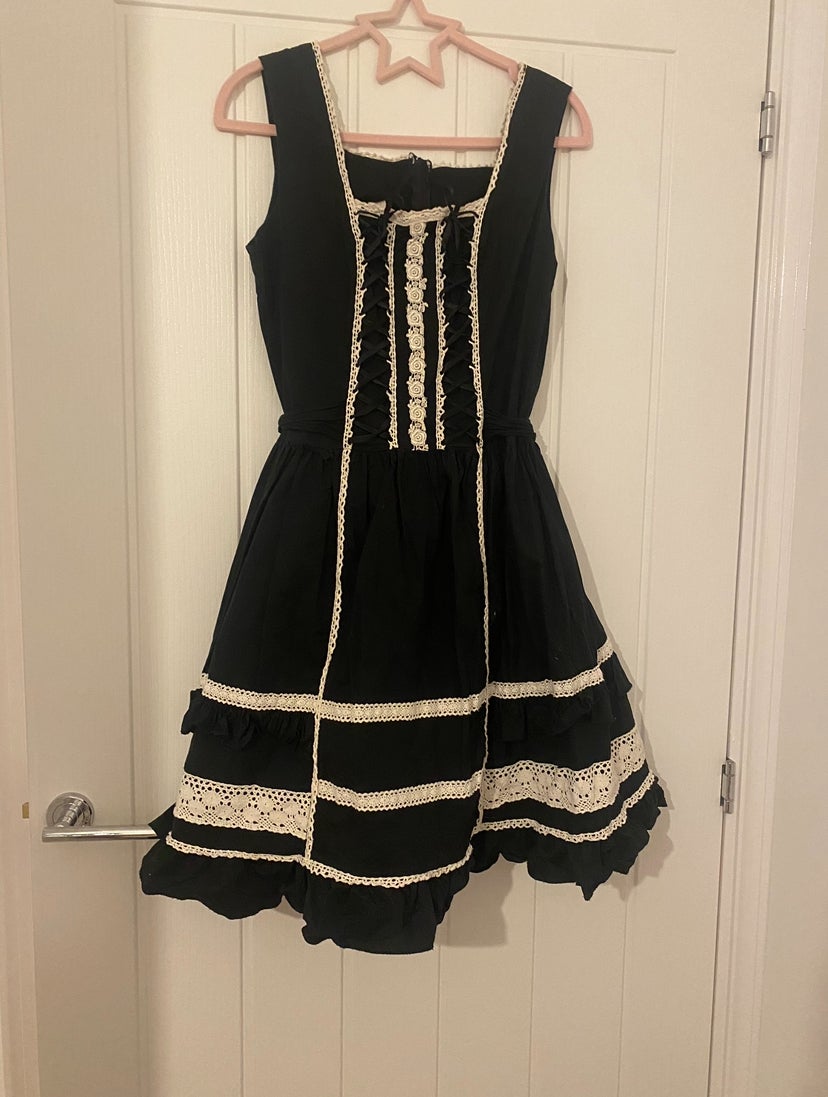 You'll be ready for a midnight picnic in this black dress! It features white lace accents on the lower half and center panel, black ribbon and bow accents, a tulle underlay and back zip entry.
