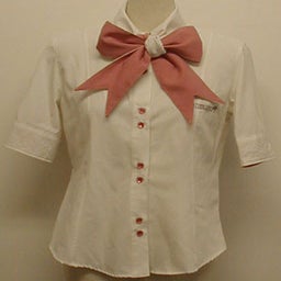 襟部分が長く、結ぶタイプのブラウス。襟は配色になっているので表でも裏でも結び方によって印象が変わるよ!