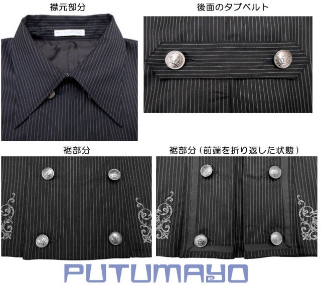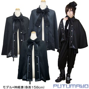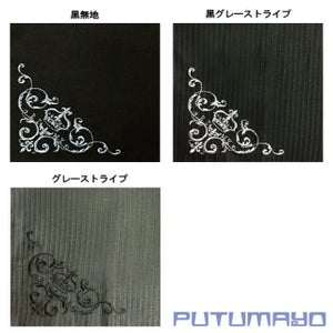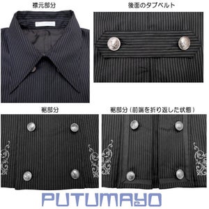 Materials (plain black): outer (70% polyester, 28% rayon, 2% polyurethane), polyester lining, cotton ribbon tie Materials (black stripe, gray stripe): outer (70% polyester, 30% rayon), polyester lining, cotton ribbon tie
