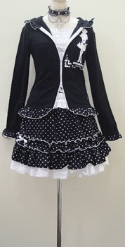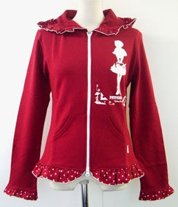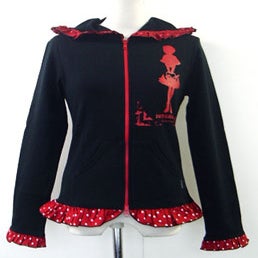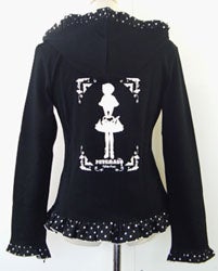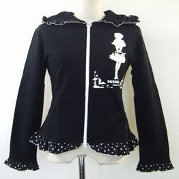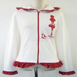 A cute hoodie with a plain body and polka dot frills around the hood, cuffs, and hem in a contrasting color!