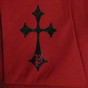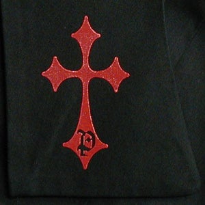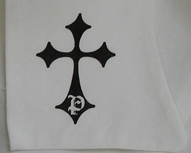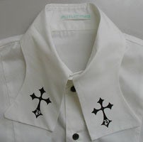 四角い襟にクロスのプリントが入ったブラウス。前開きの裾はラウンドカット、袖はダブルカフスです。