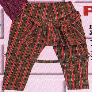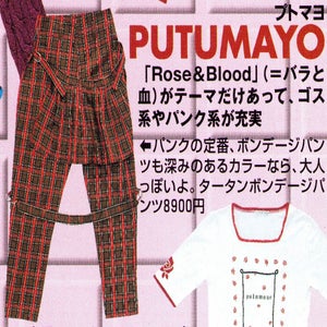 Item description: "Bondage pants, a punk staple, look more mature in a deep color. Tartan bondage pants 8,900 yen"