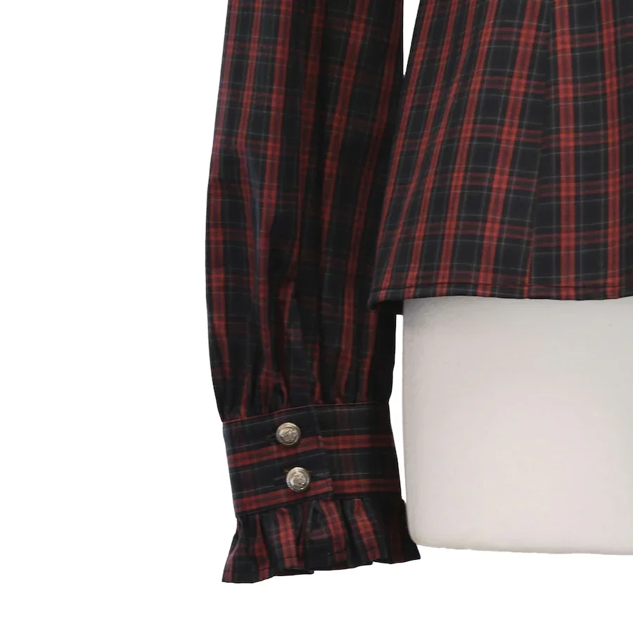 A classic Sheglit style blouse with ruffles made from the same fabric at the collar and cuffs.