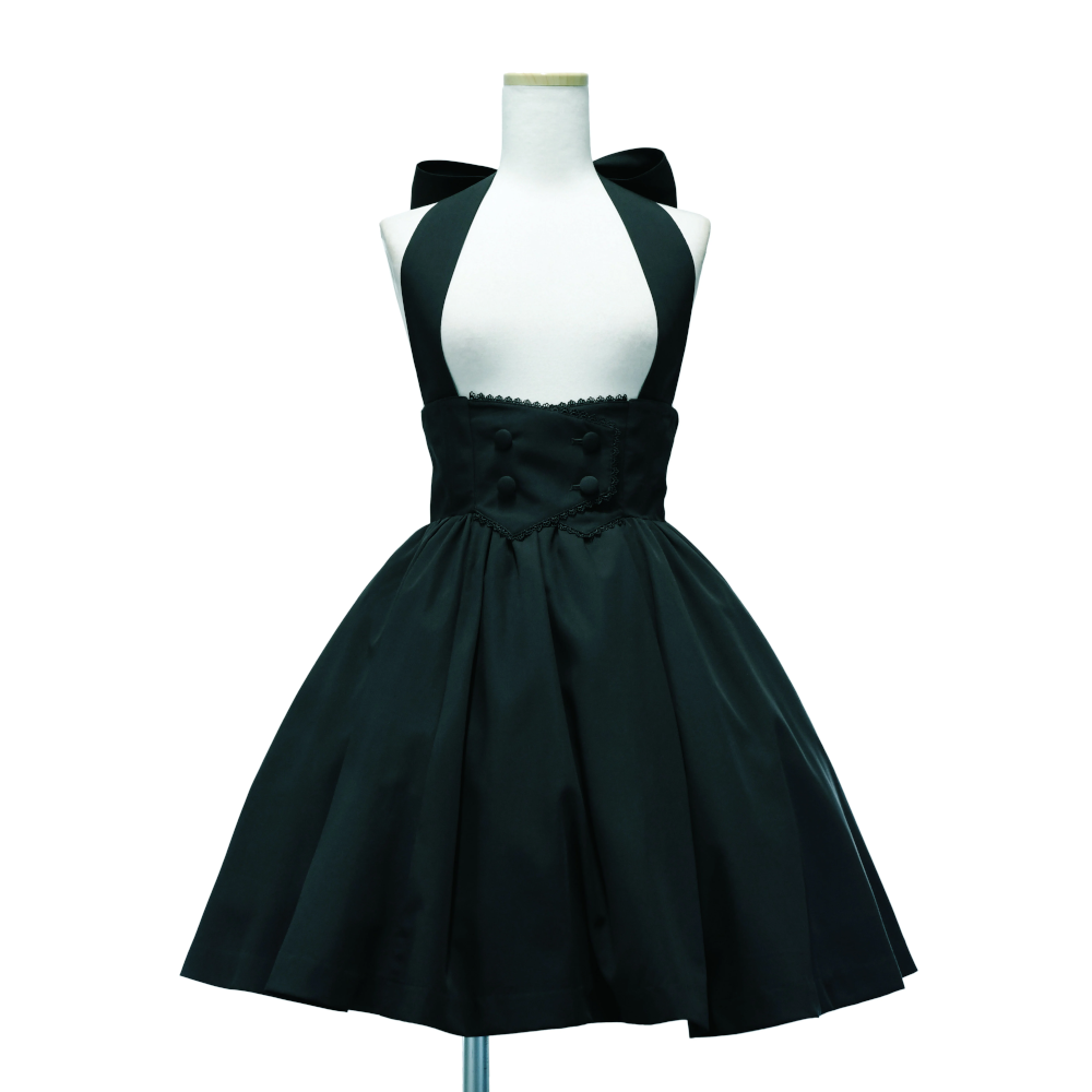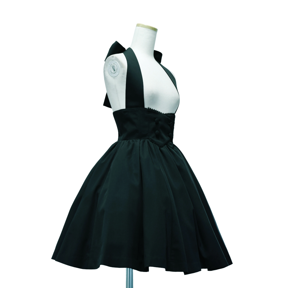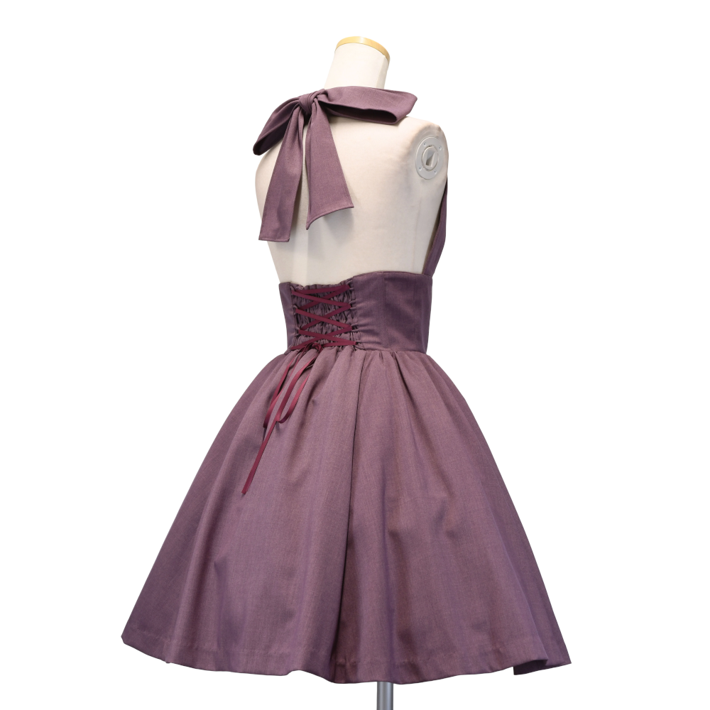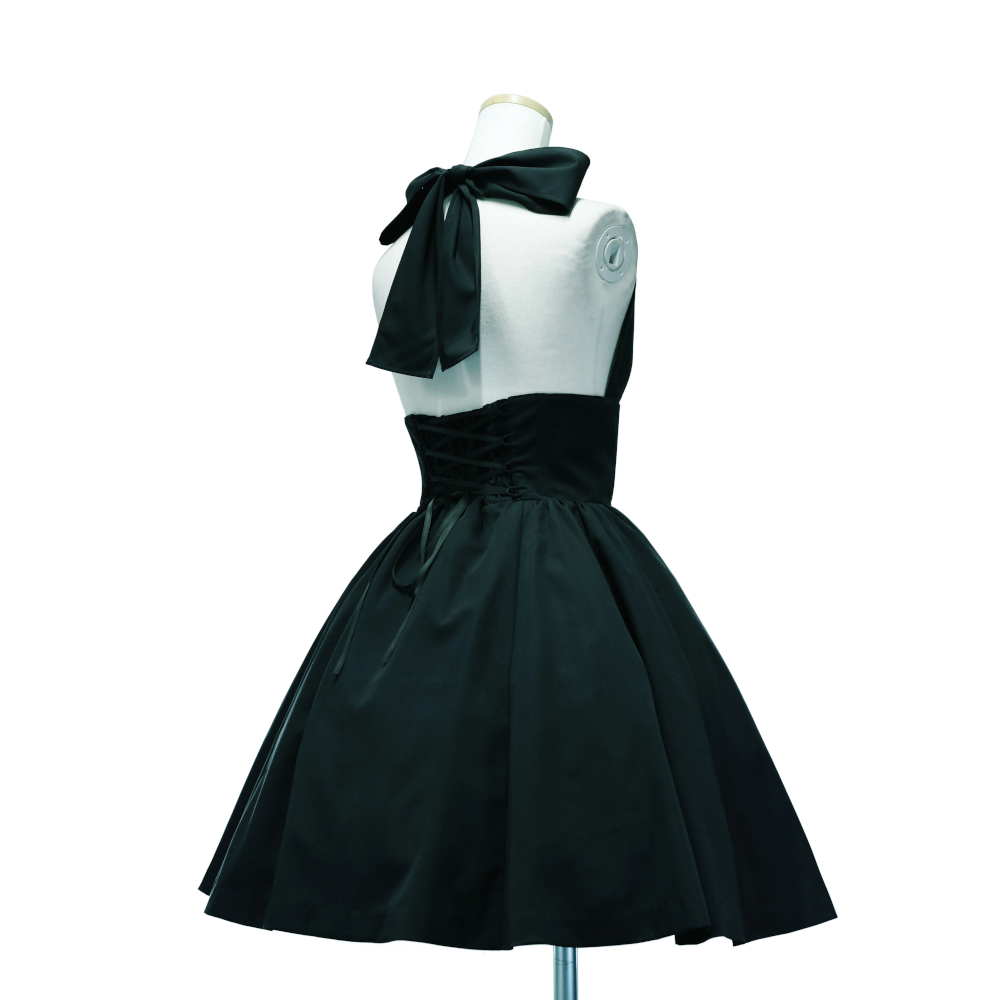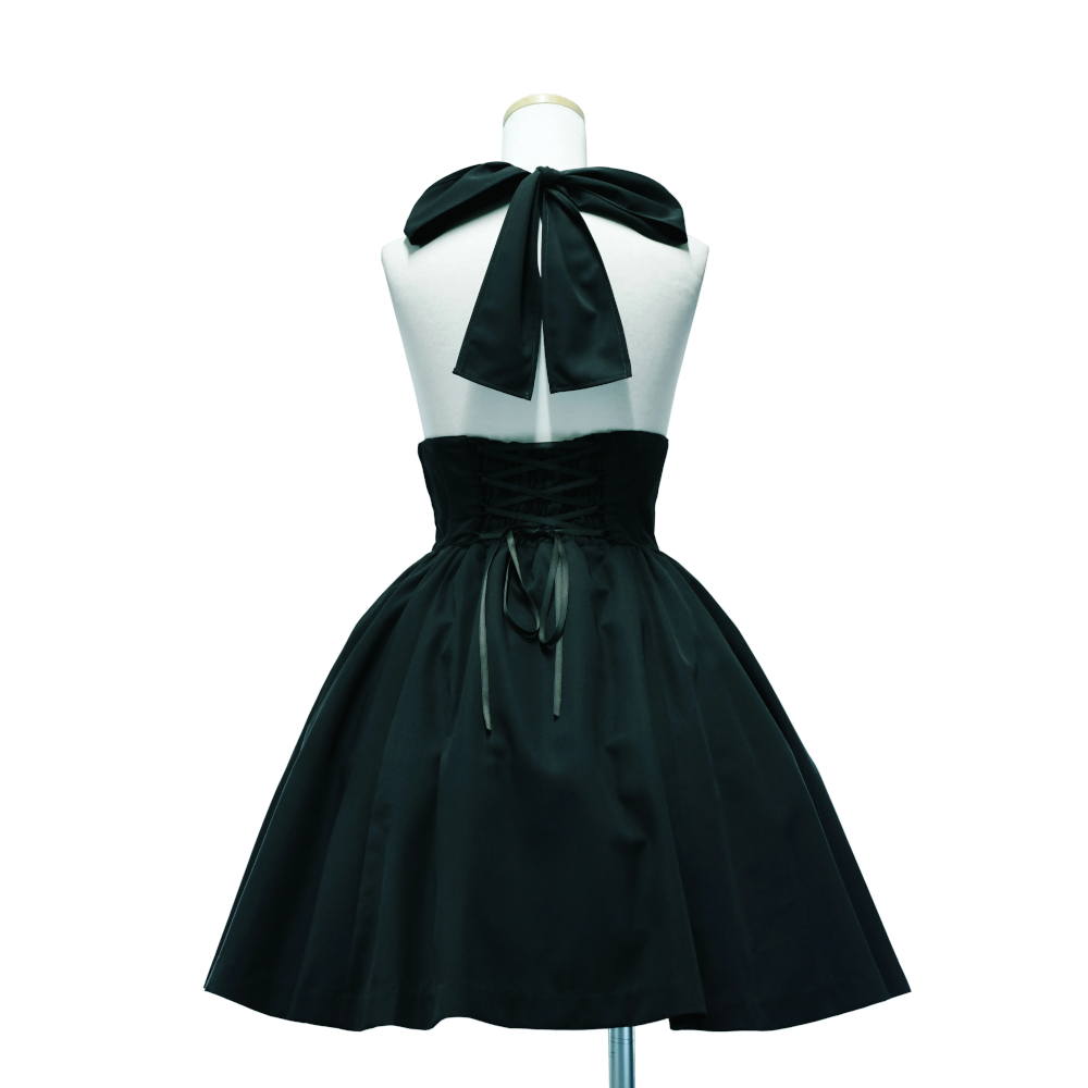 The waist features a corset design with two bones on the front and back. The shirred back and lace-up design create a beautifully cinched silhouette. The skirt has built-in ruffles on the inside and delicate gathers for a softly voluminous look. Additionally, the halter ribbon is removable with buttons, allowing for a wide range of coordination options.