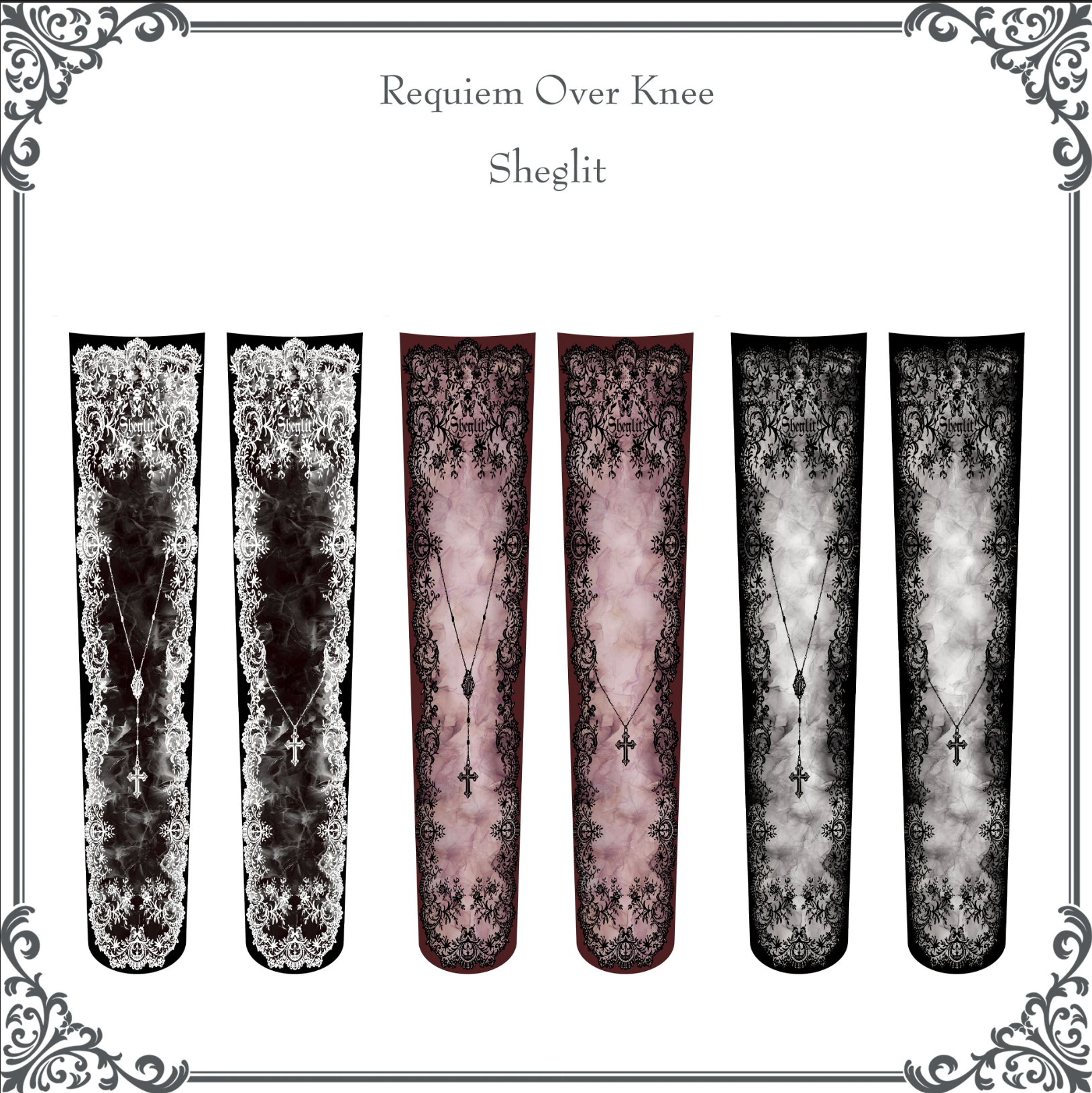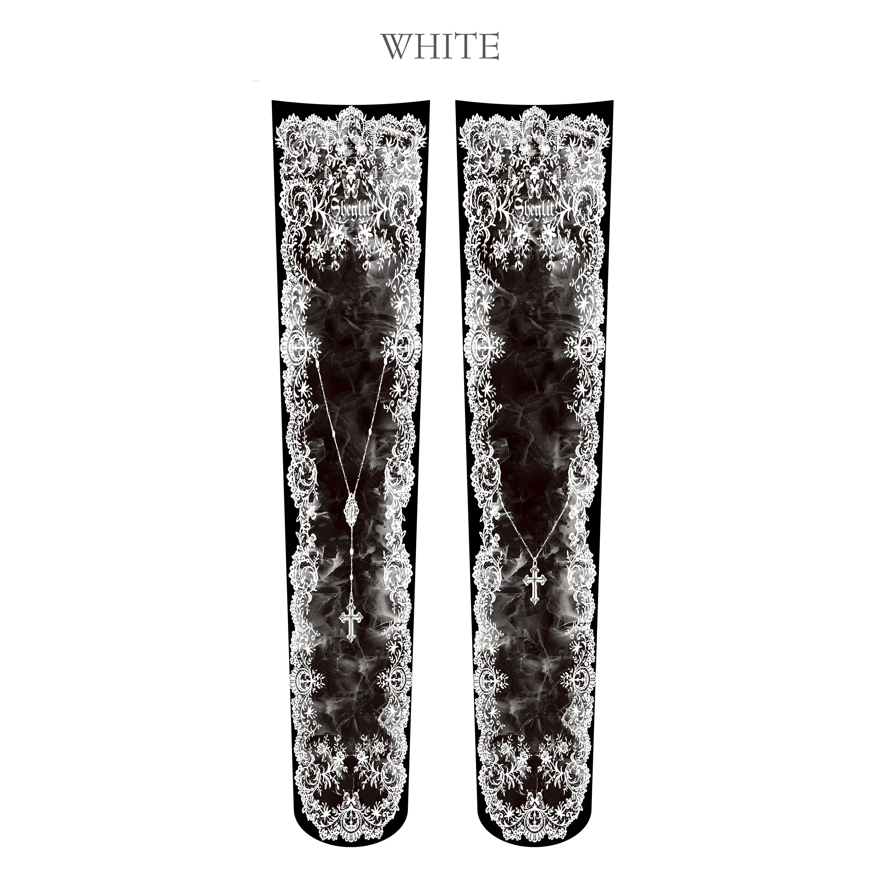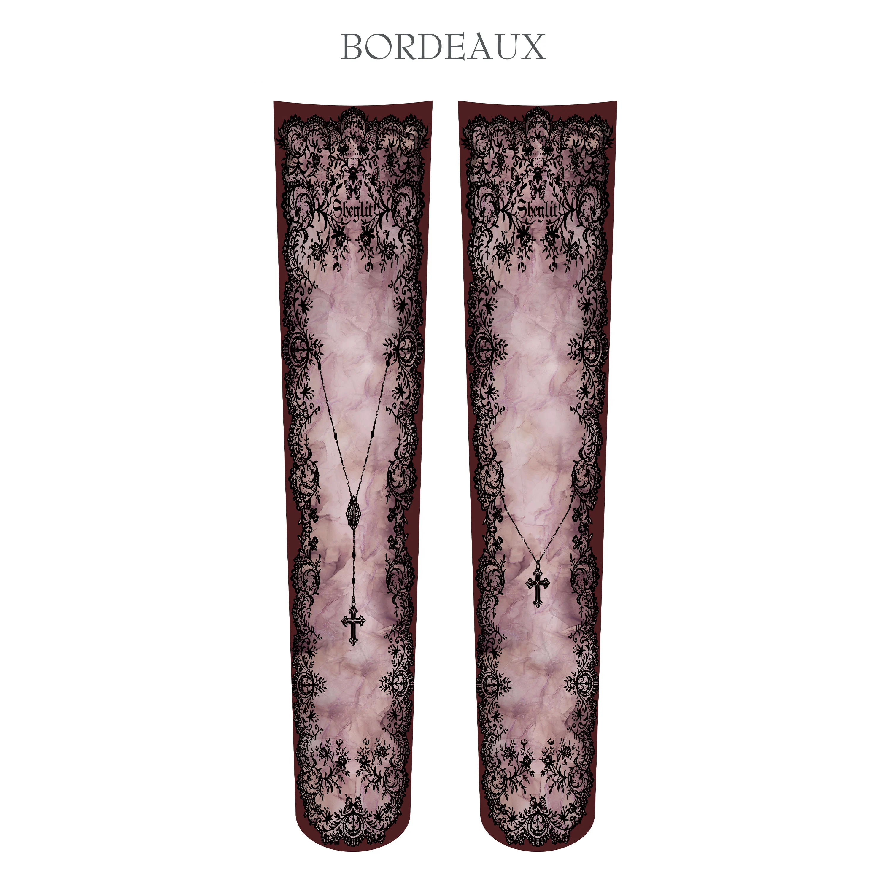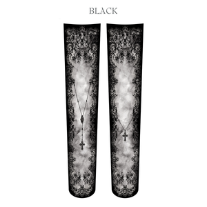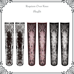 [Brand comment] These over-the-knee socks feature delicate lace motifs and a cross necklace pattern that evokes a sense of prayer. The design, reminiscent of an antique lace veil, gives your legs a dignified and serene presence. The smoky gradient in the center adds depth and sophistication, balancing sweetness with a refined elegance. They perfectly complement your outfit while creating a distinctly Sheglit gothic-classic mood. The 80-denier thickness provides a comfortable and opaque fit. The over-the-knee length makes them ideal for pairing with dresses and skirts. Available in three colors: white, burgundy, and black. Enjoy a different look depending on the tone of your outfit.