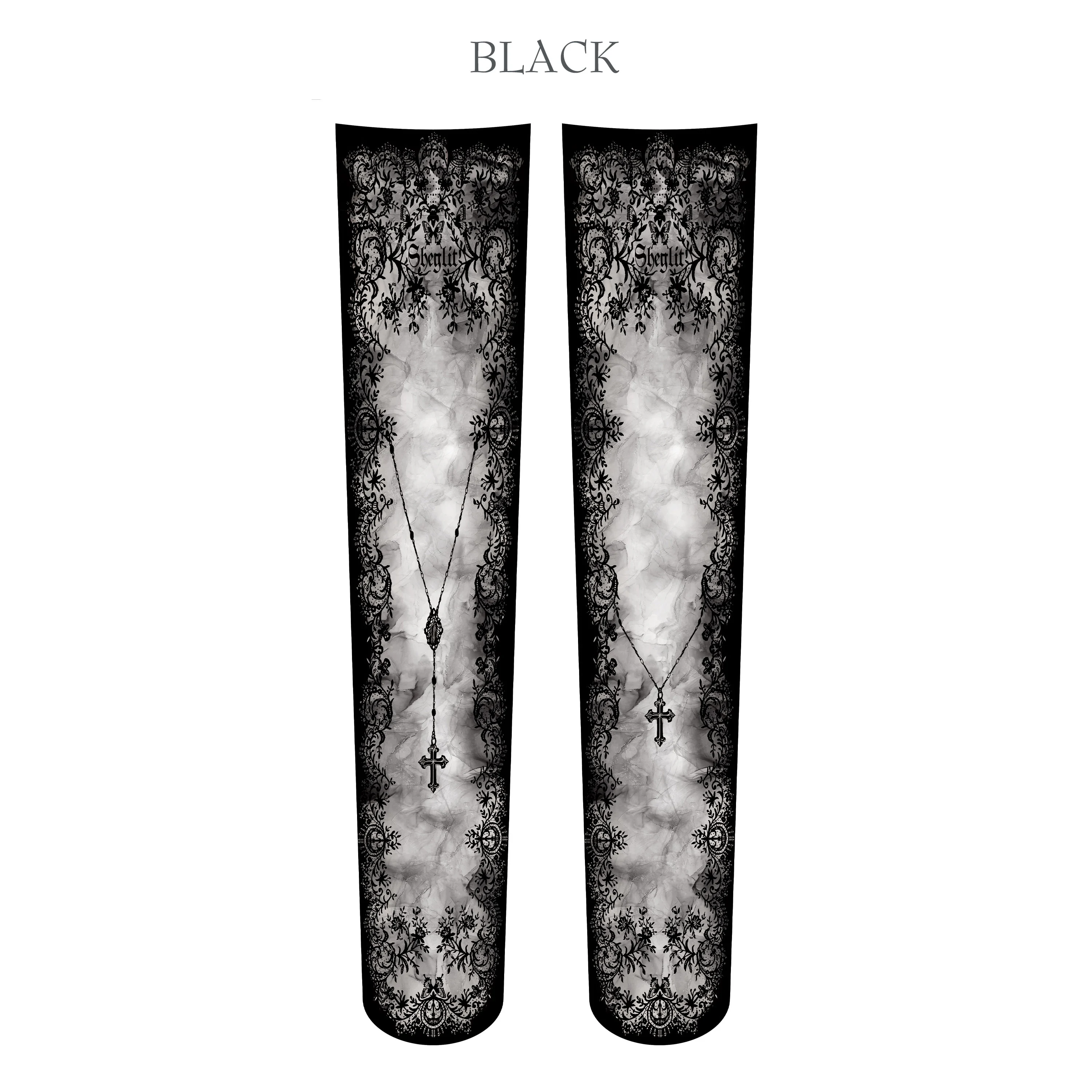 繊細なレースモチーフと、祈りを想起させるクロスネックレス柄をあしらったオーバーニーソックス。まるでアンティークレースのヴェールを纏ったかのようなデザインが、足元に厳かで静謐な存在感を与えます。中央に浮かび上がるスモーキーなグラデーションは、甘さを抑えつつも奥行きのある表情を演出。コーディネート全体を引き締めながら、Sheglitらしいゴシッククラシックなムードを完成させてくれます。80デニールの程よい厚みで、透け感を抑えた安定感のある履き心地。オーバーニー丈のため、ワンピースやスカートスタイルとの相性も抜群です。カラーはホワイト・ボルドー・ブラックの3色展開。装いのトーンに合わせて、それぞれ異なる表情をお楽しみいただけます。