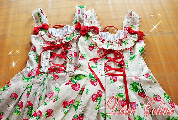 ☆Dear Celine 草莓季风 棉麻提花质地草莓花纹连身裙☆