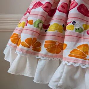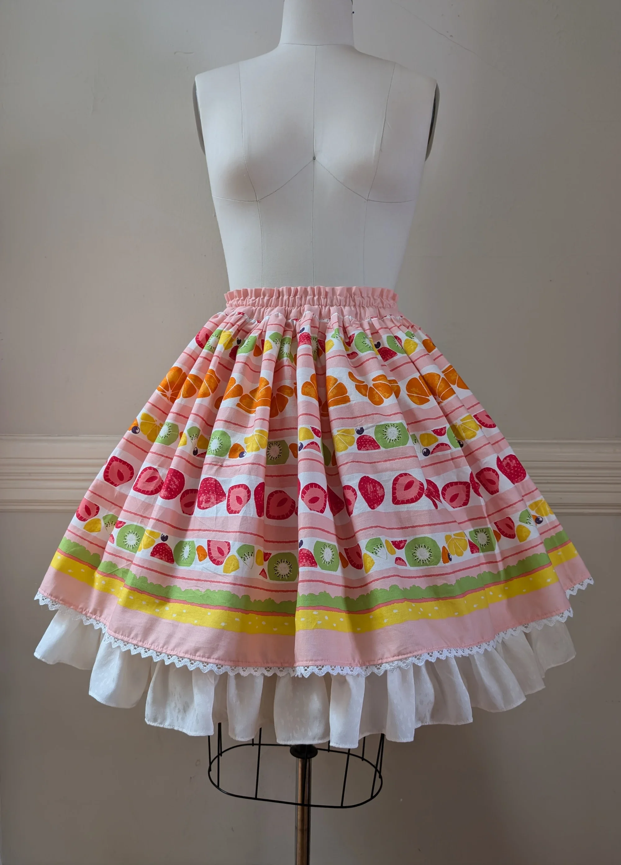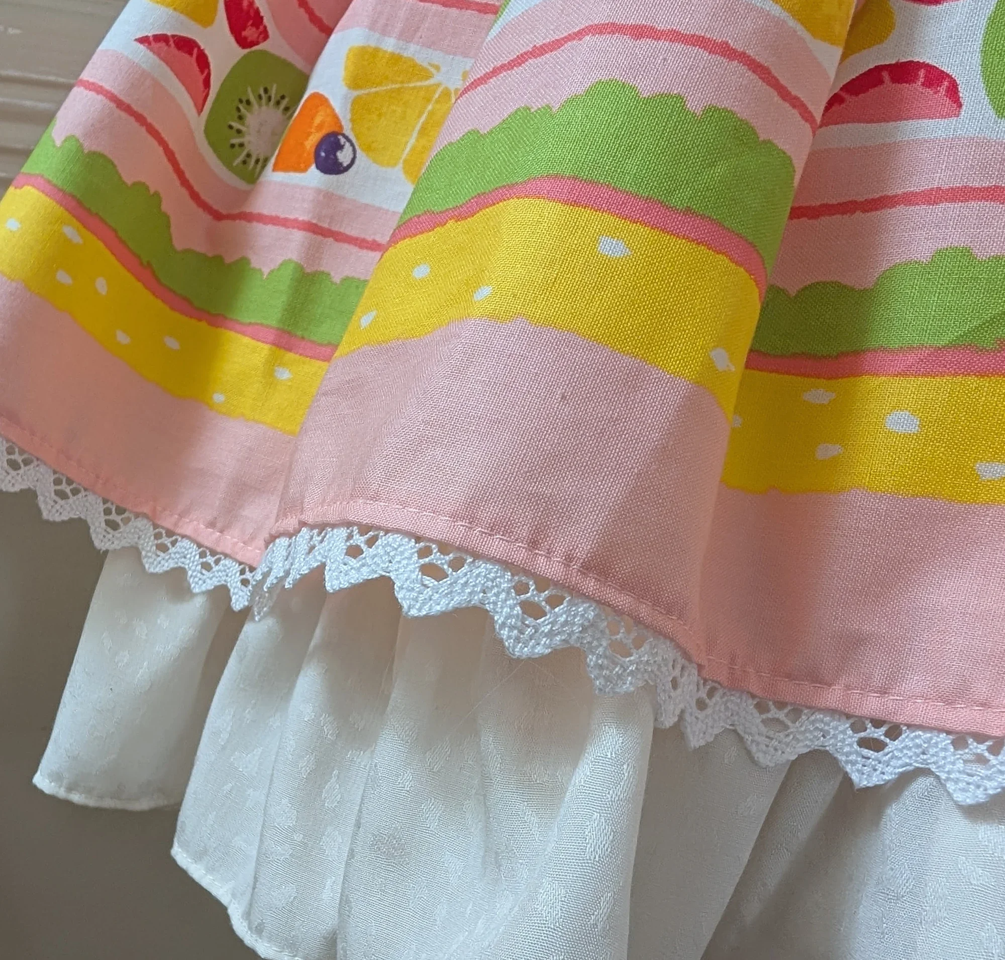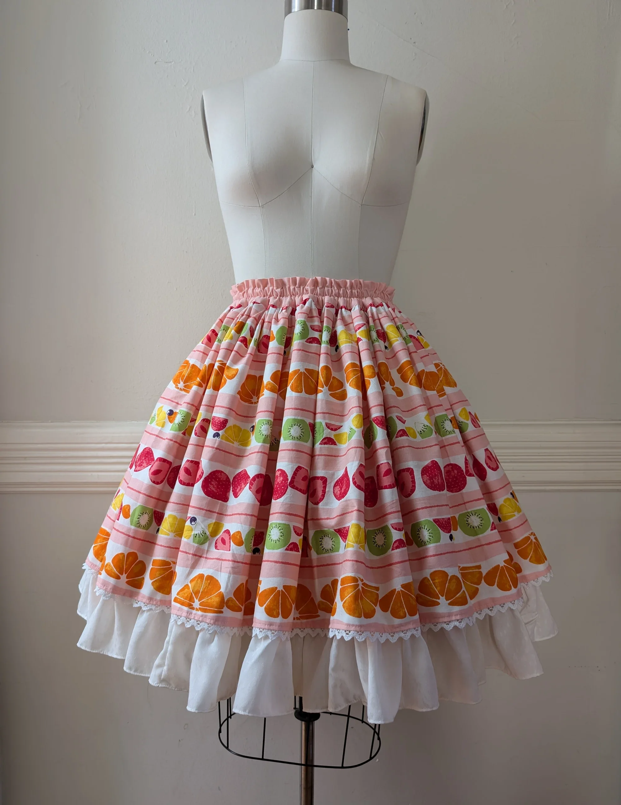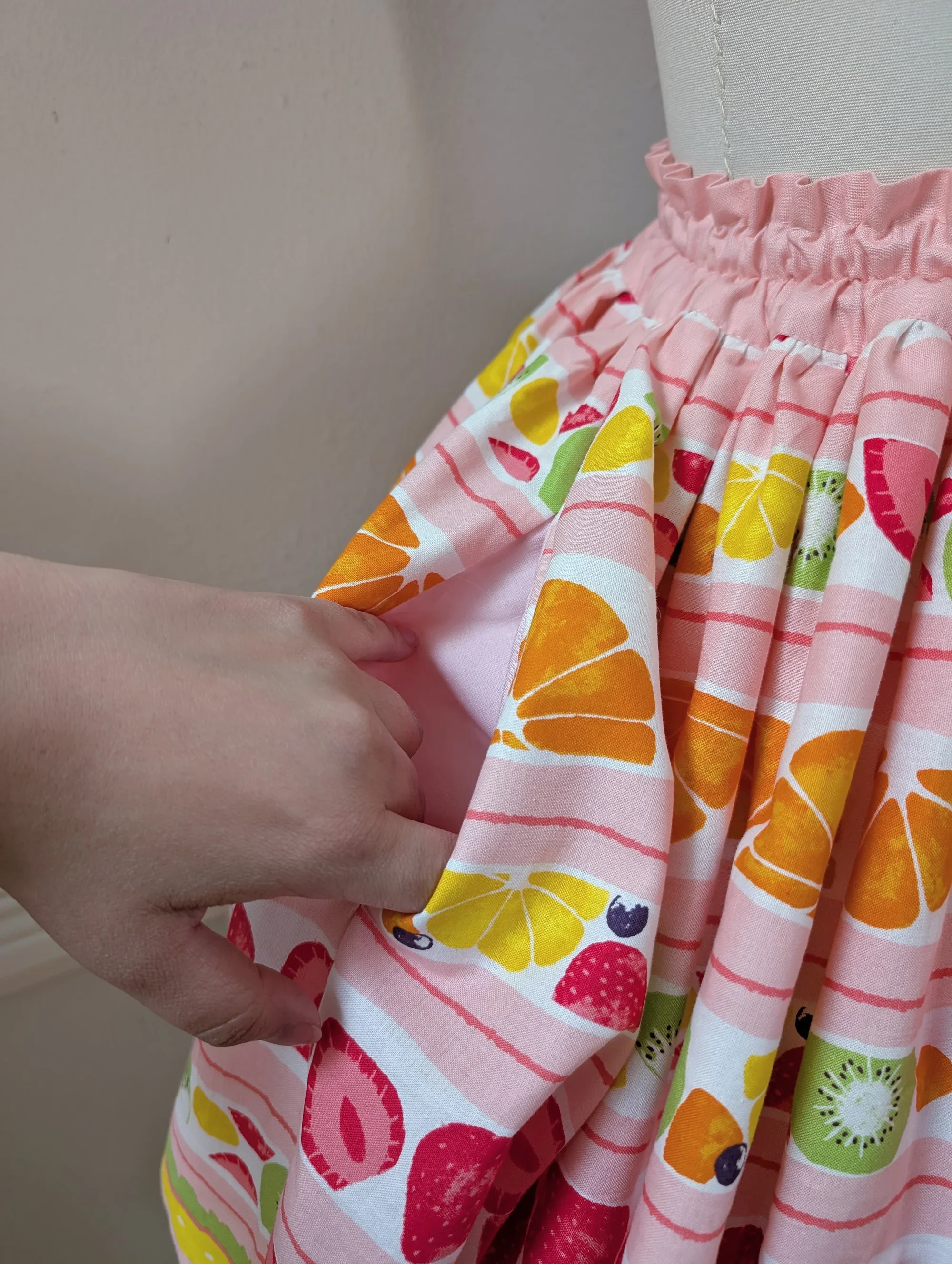 Skirt is fully lined, with fully shirred waistband, and side seams pocket. Trimmed with white cotton cluny lace and an off white rayon jacquard ruffle to mimic whipped cream!