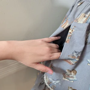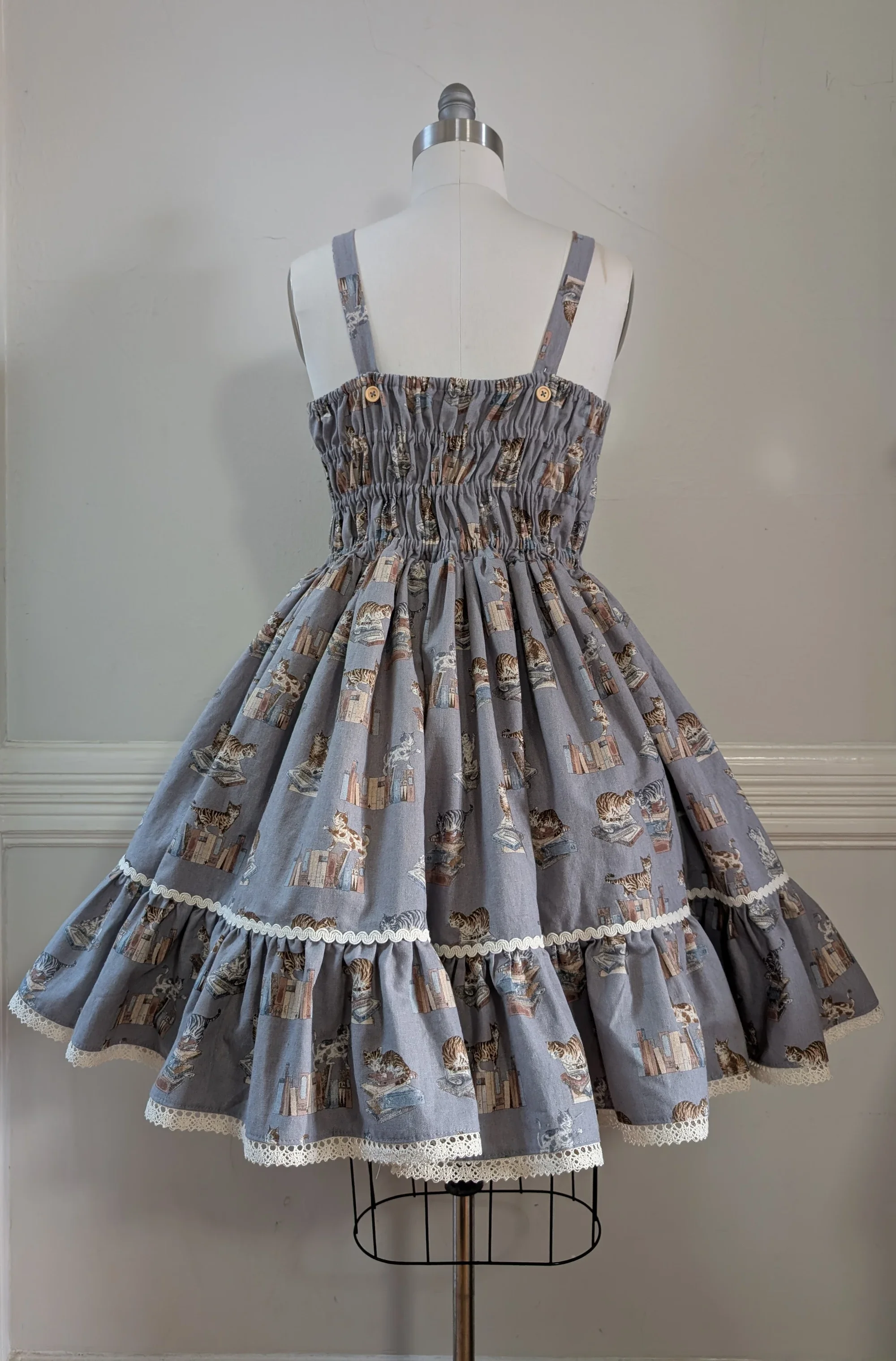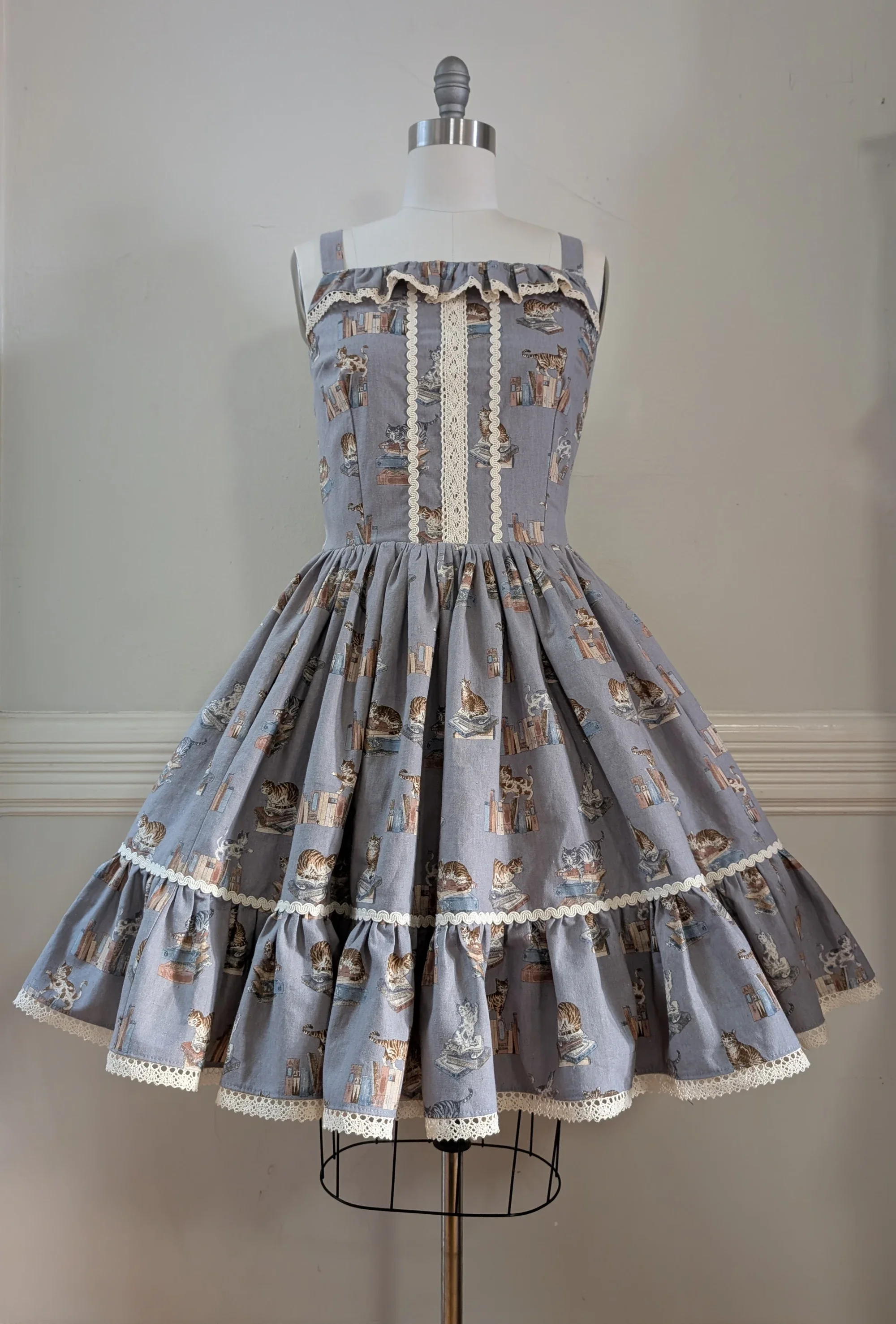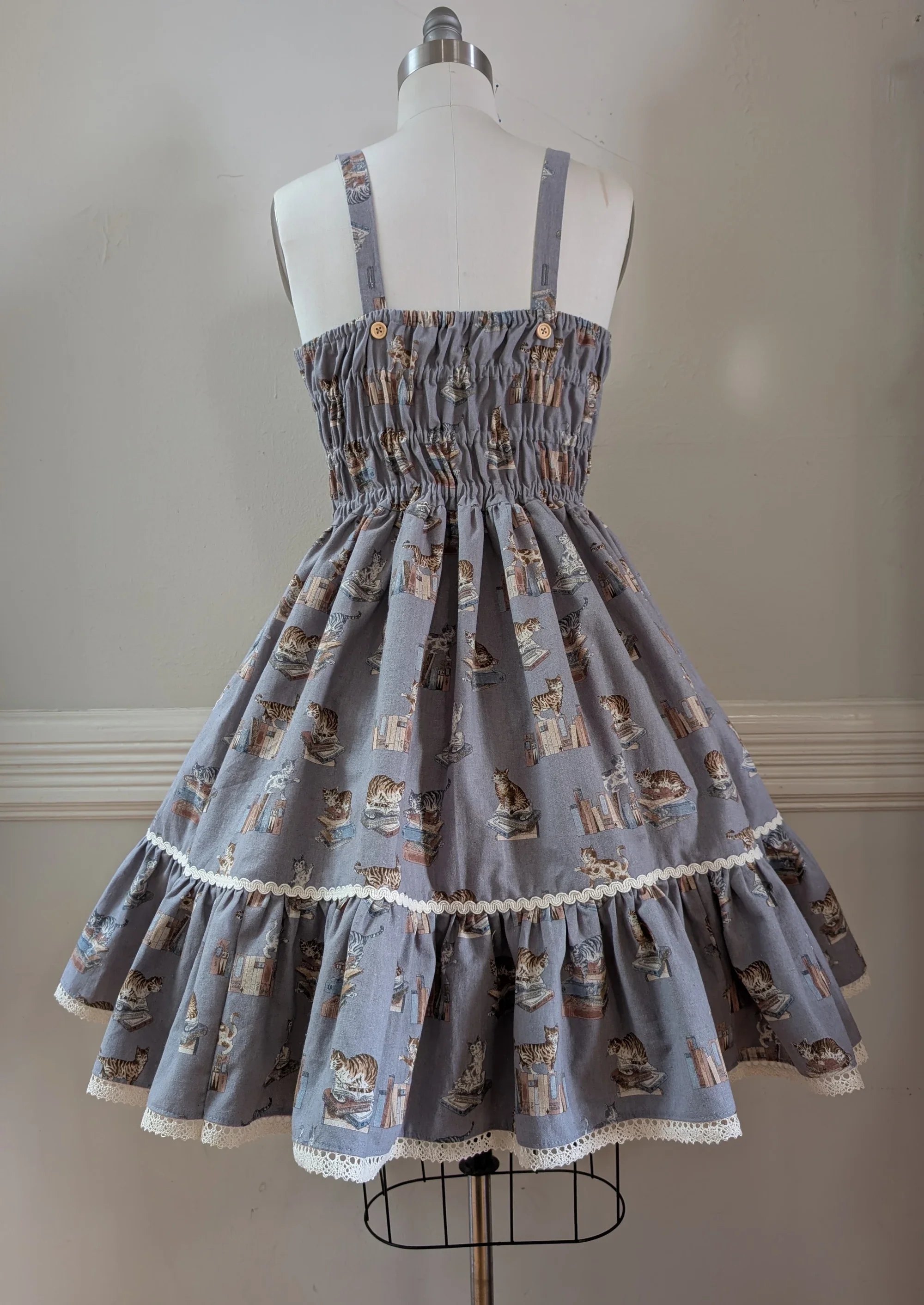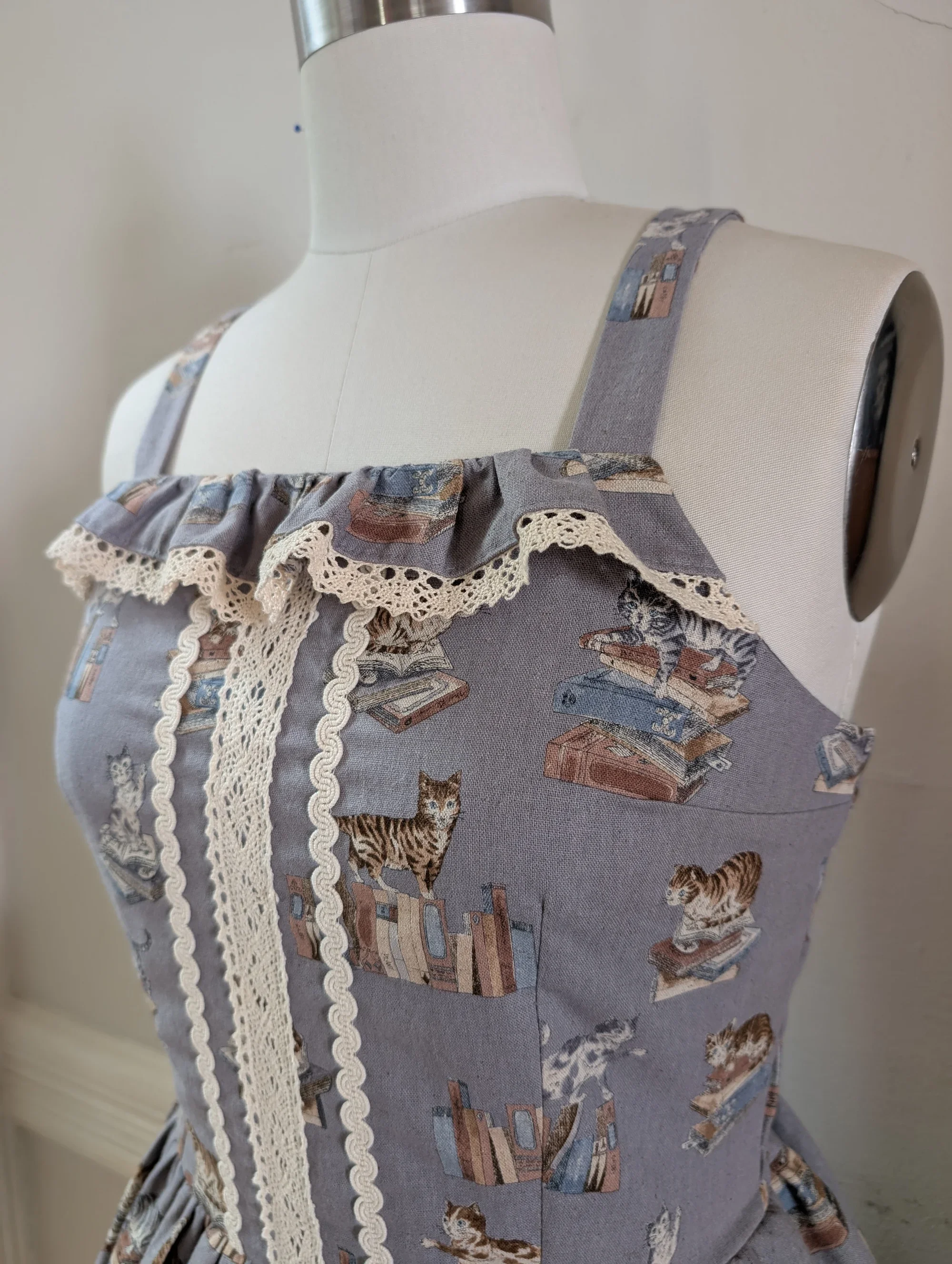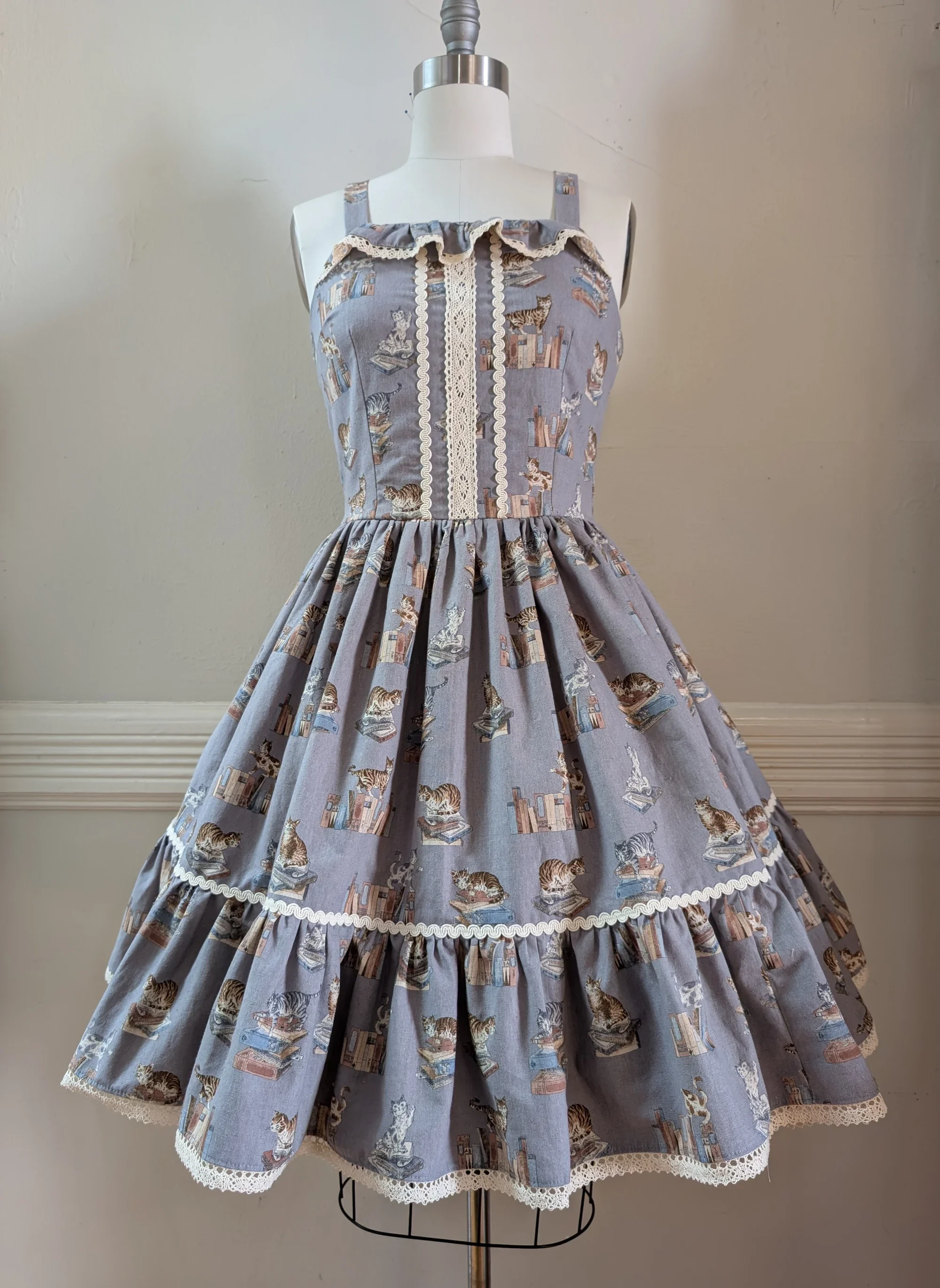 We're finishing up the last of our Library Cats fabric! This one off JSK features cotton lace and trims and a cotton lined bodice so it is perfect for summer wear. There are 2 side seam pockets, and the skirt is fully lined.