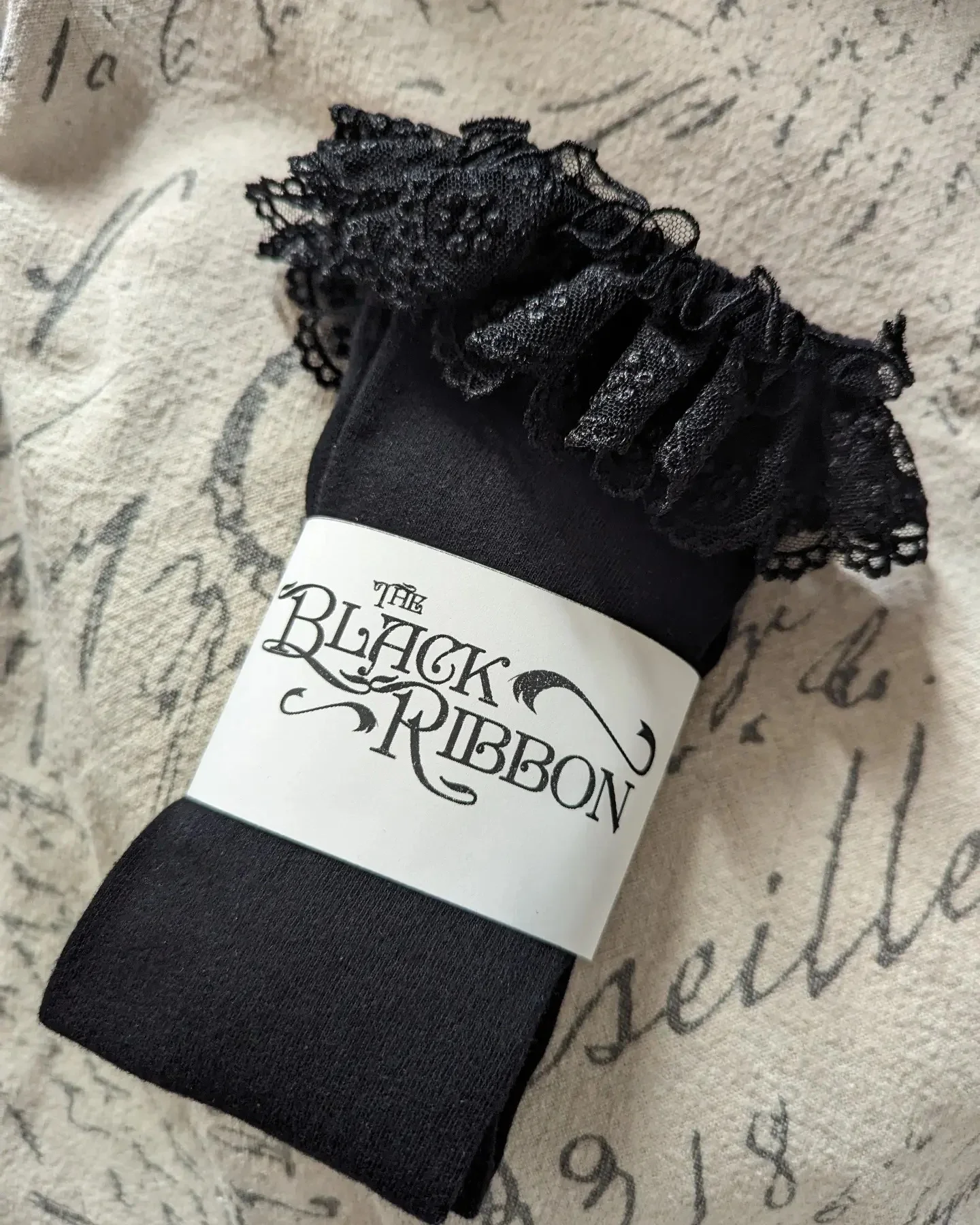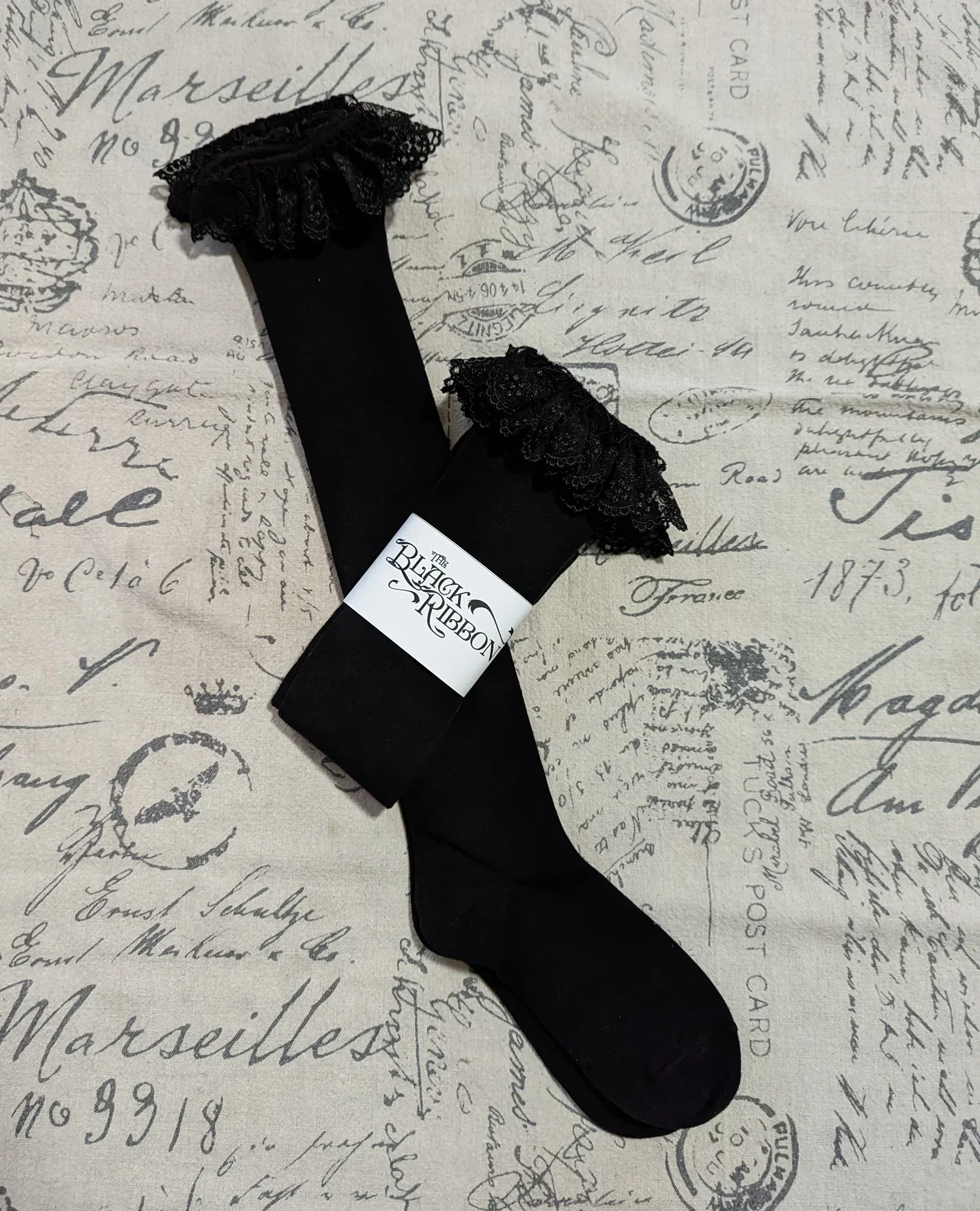 Beautiful French embroidered net lace with a floral motif adorns these elegant socks. The lace is gathered so that even at max stretch it stays slightly ruffled!