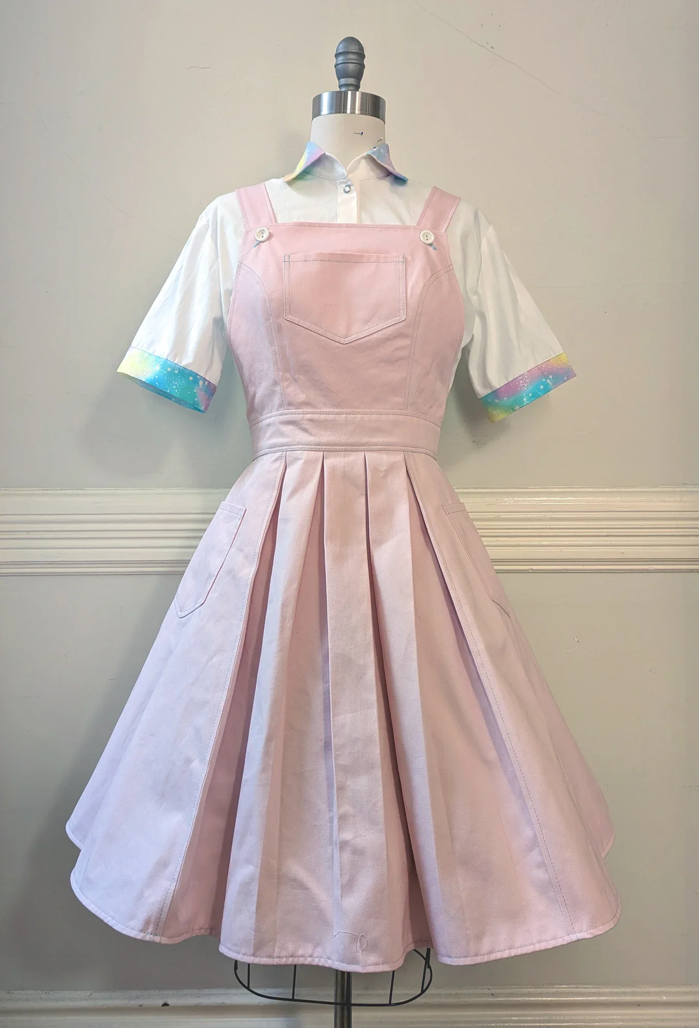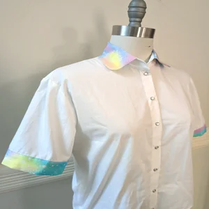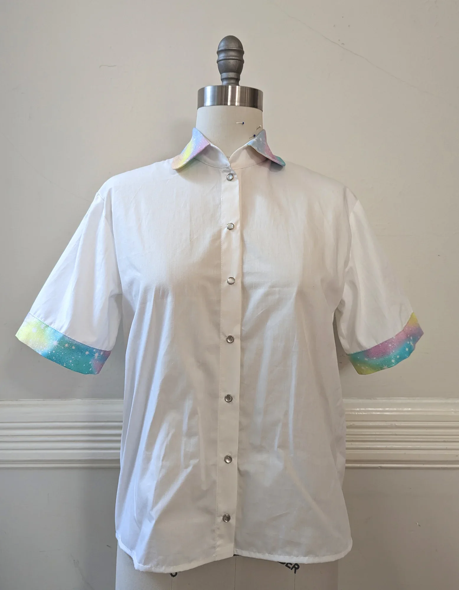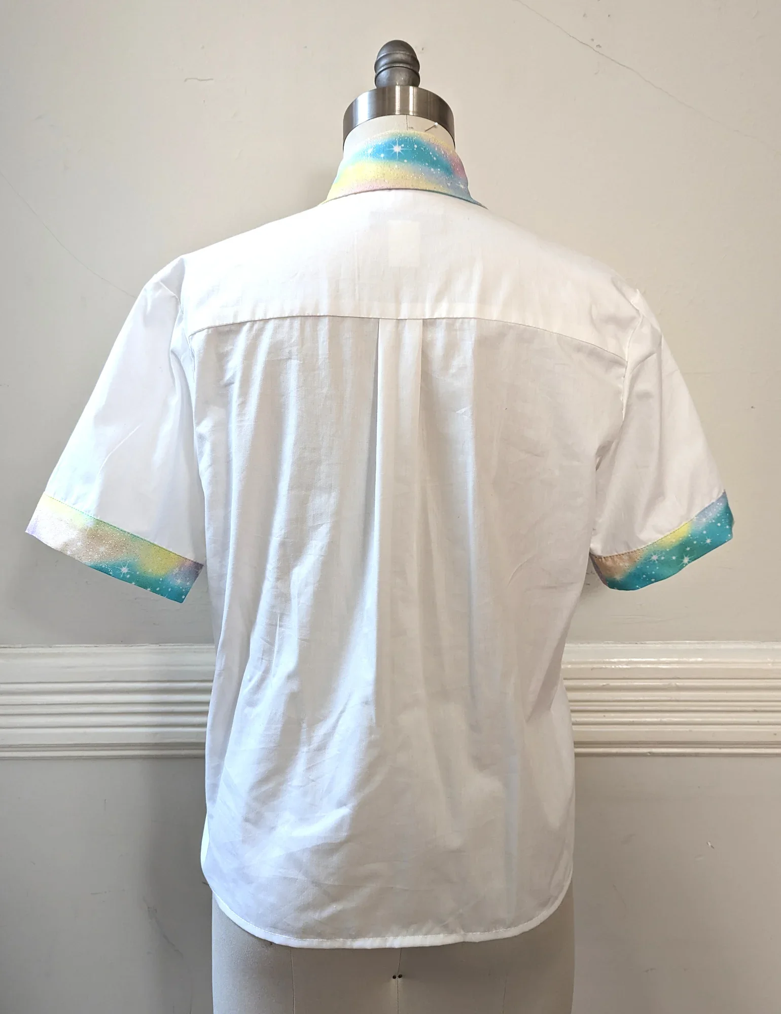 Perfect for your casual j-fashion coordinates, this light weight 100% cotton blouse features snaps and contrast collar and cuffs in a glittery pastel spacey rainbow print. Snaps down the front, and is a boxy relaxed fit.