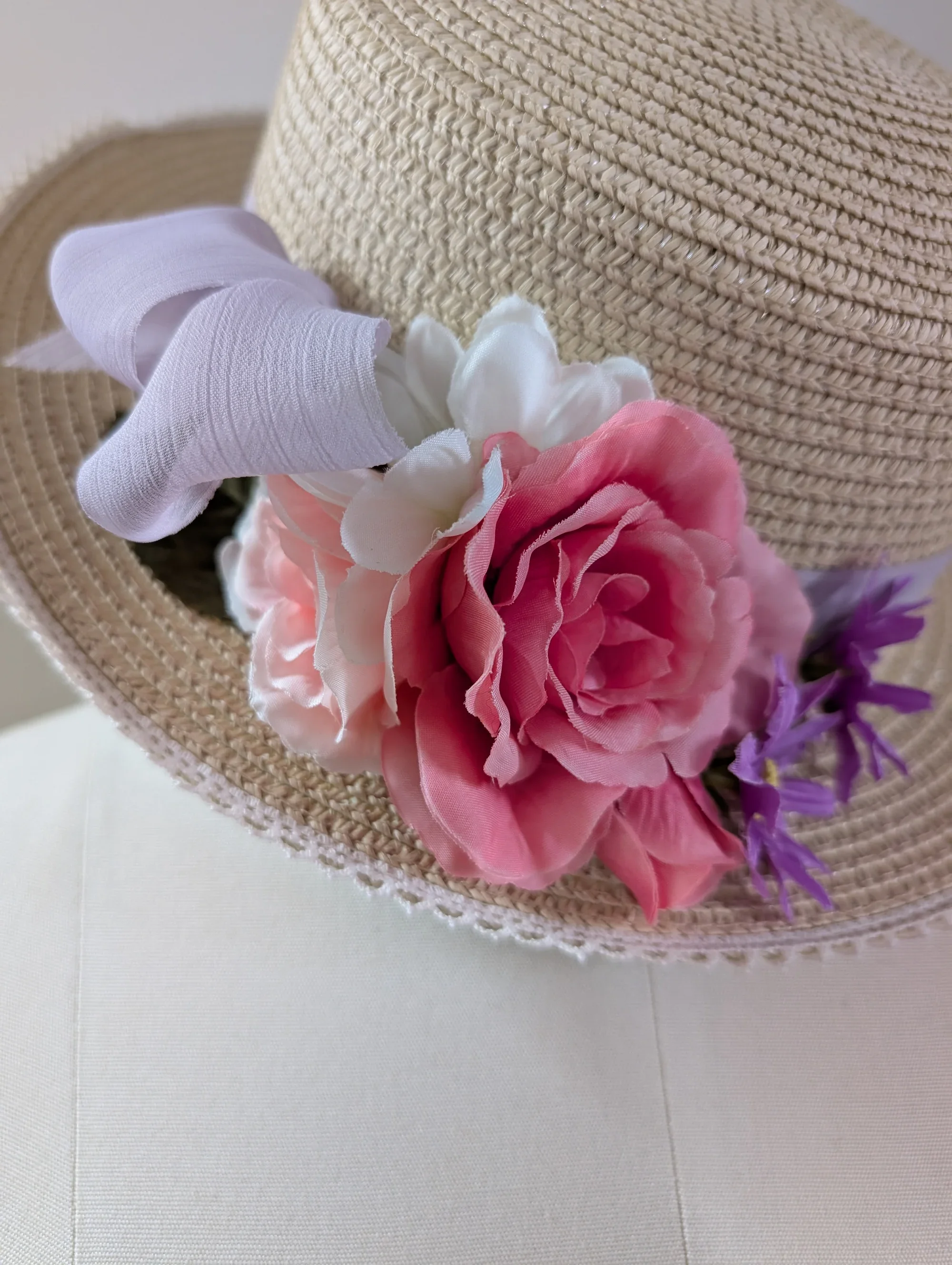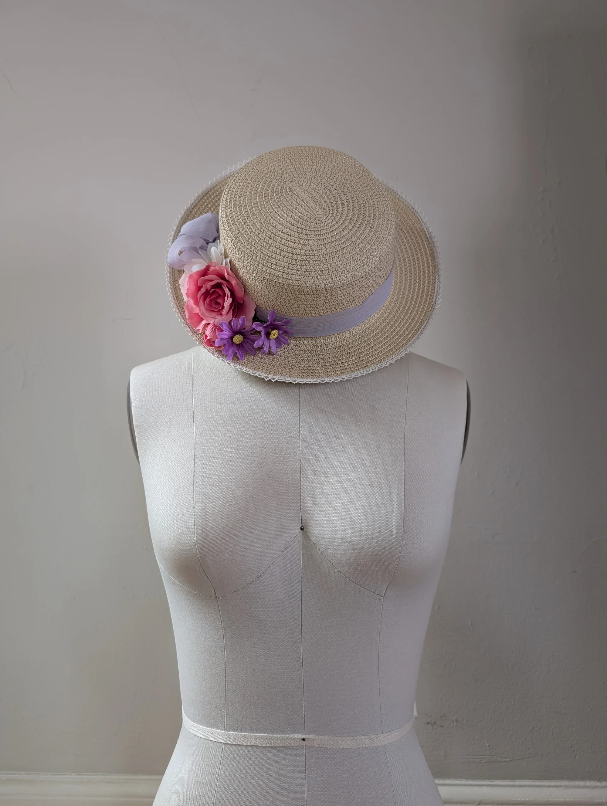 Paper straw boater hat with trims that match our Rose Bouquet print.