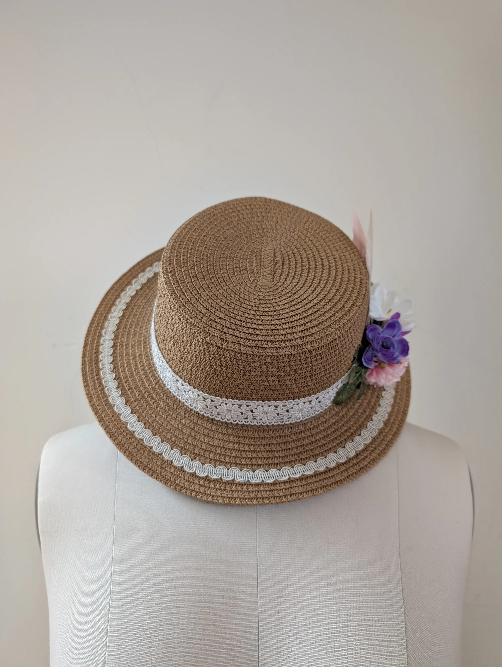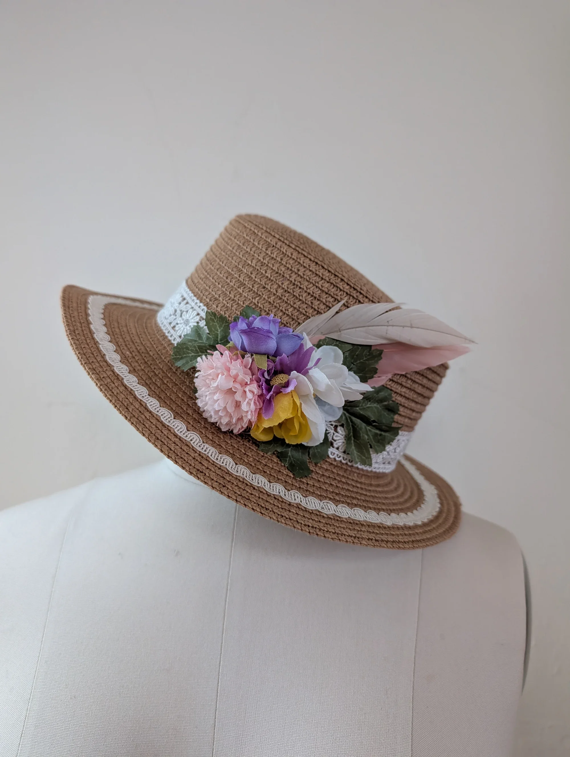 Paper straw boater hat with lace, flowers, feathers, and braid trim. Trims are sewn to hat base.