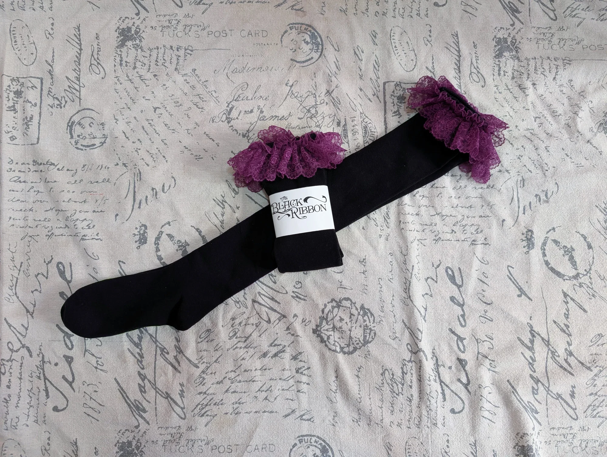 Beautiful embroidered lace with a floral motif adorns these elegant socks. The lace is gathered so that even at max stretch it stays slightly ruffled!