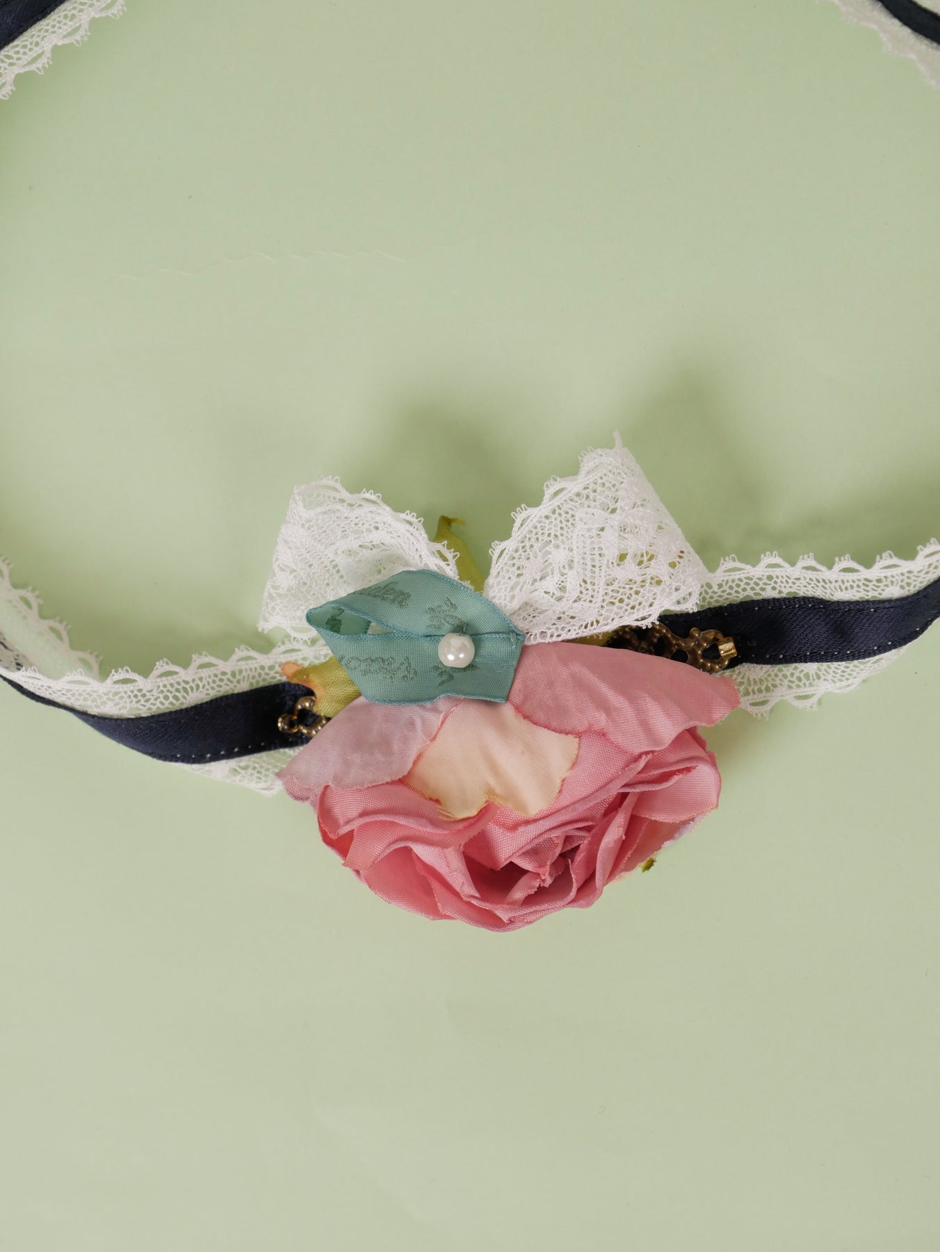 繊細なレースとアンテーク調のダスティローズカラーの薔薇コサージュがヒストリカルなアクセサリーです。ドライフラワーをイメージして、あえて逆さに吊るしたコサージュの土台にはメタルプレートを施してアンティーク感漂うクラッシカルな仕上がりに。チョーカーとしてだけではなく、帽子や手首に巻いてプラスワンアイテムとして着用いただいても素敵です。