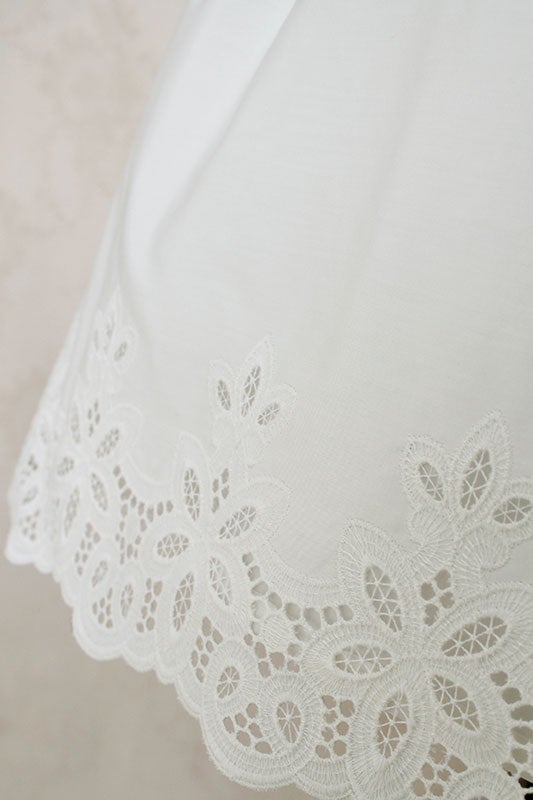 Delicate tulle lace on the hem, chest and cuffs with gorgeous embroidery.