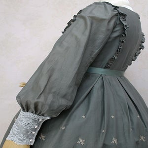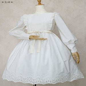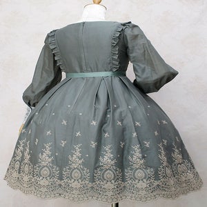 華やかな刺繍が施された裾や胸元とカフスの繊細なチュールレースが清楚でクラシカルなドレスです。