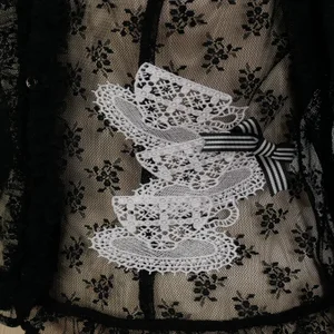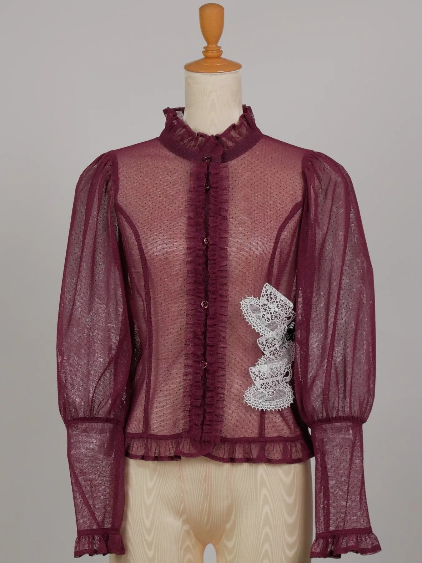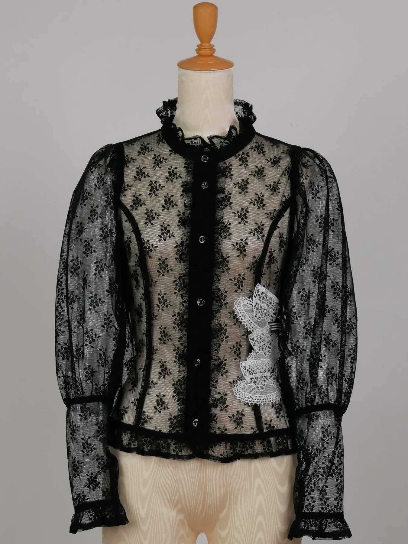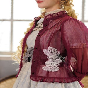 A special specification is a striped gross ribbon with a gross ribbon, in an Amelia Lacy blouse cardigan made of a slightly sheer floral pattern raschel lace and dot tulle fabric, and as a special specification, we have three large teacup-shaped rayon material motif laces. The large mutton sleeves and long cuffed sleeves attract femininity.