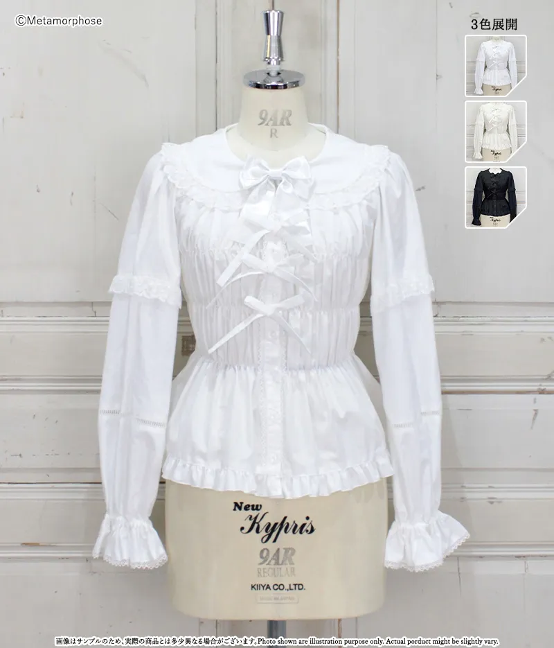 【プラスサイズ】レース切替丸襟シャーリングブラウス