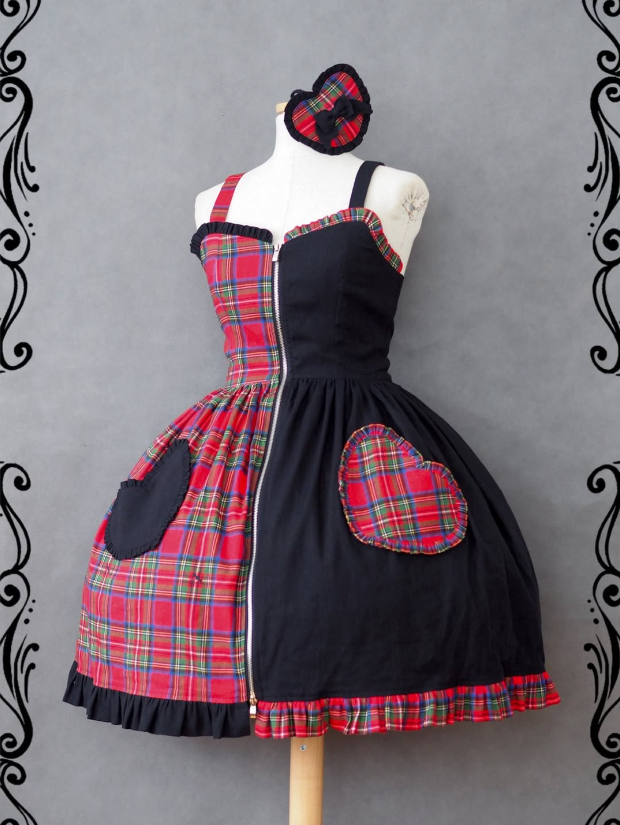 裾スカラップタータンチェックジャンパースカート&リボンコームセット