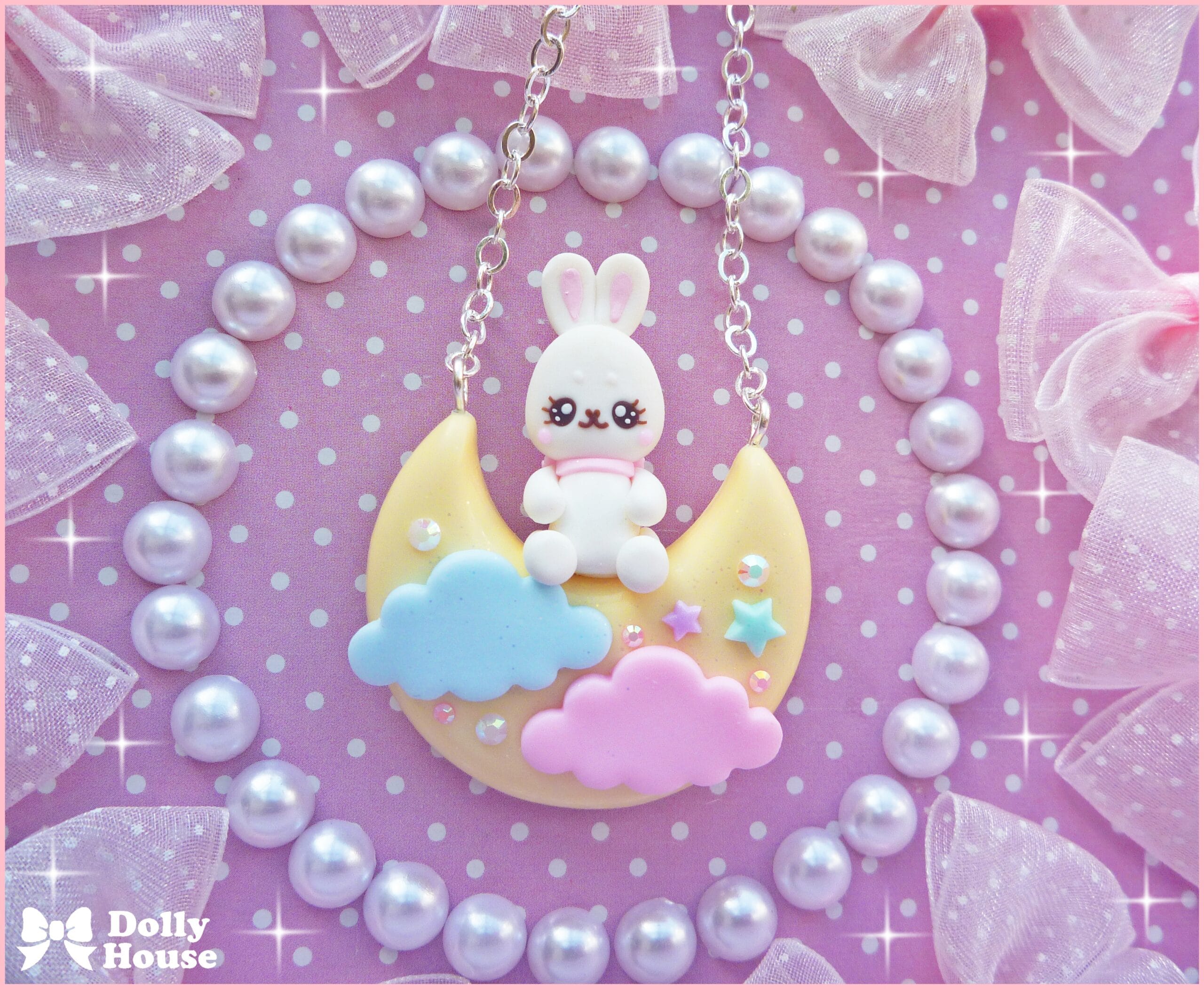 Dolly House ~ Dreamy Bunny Dreams Necklace with Moon & Pastel Clouds